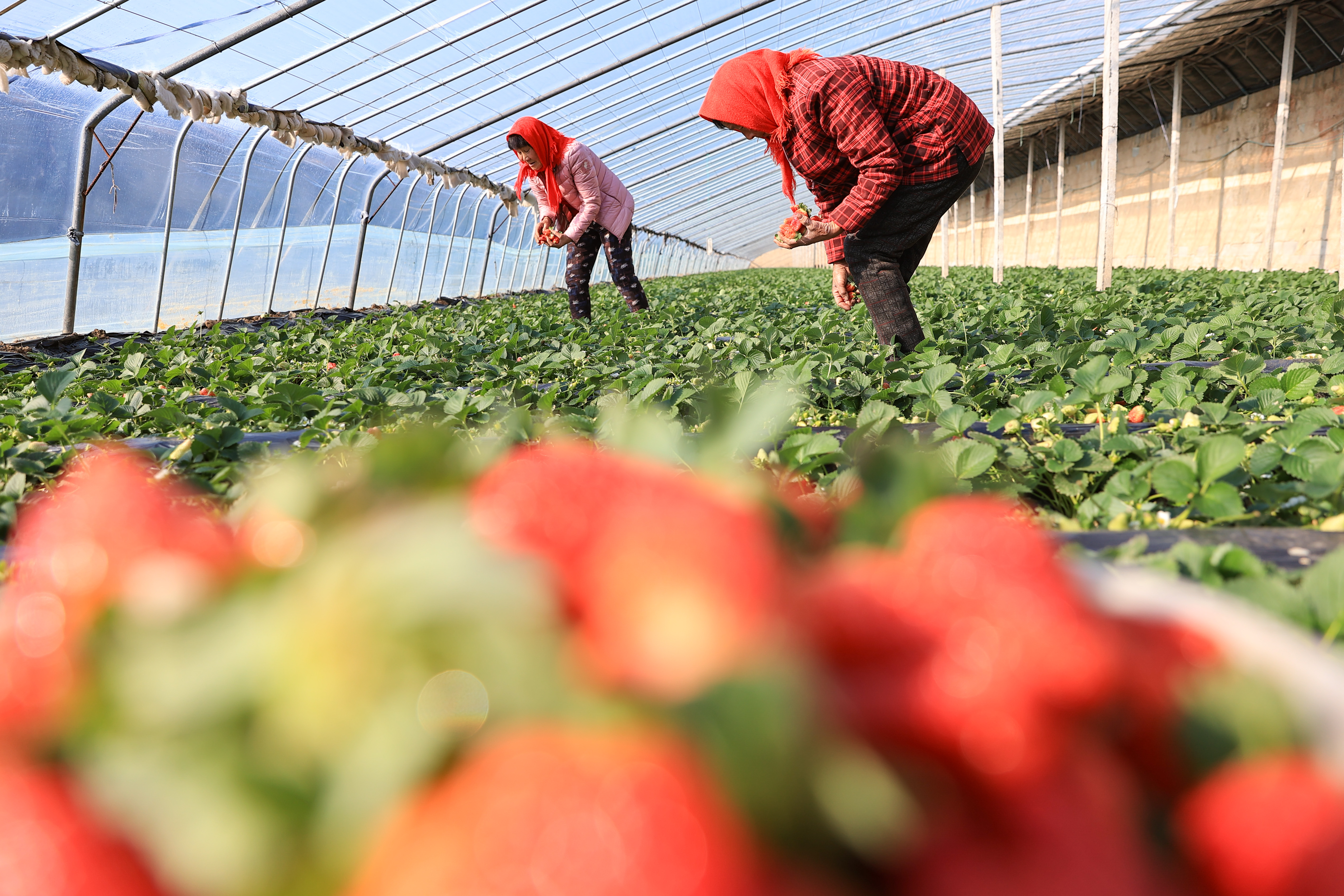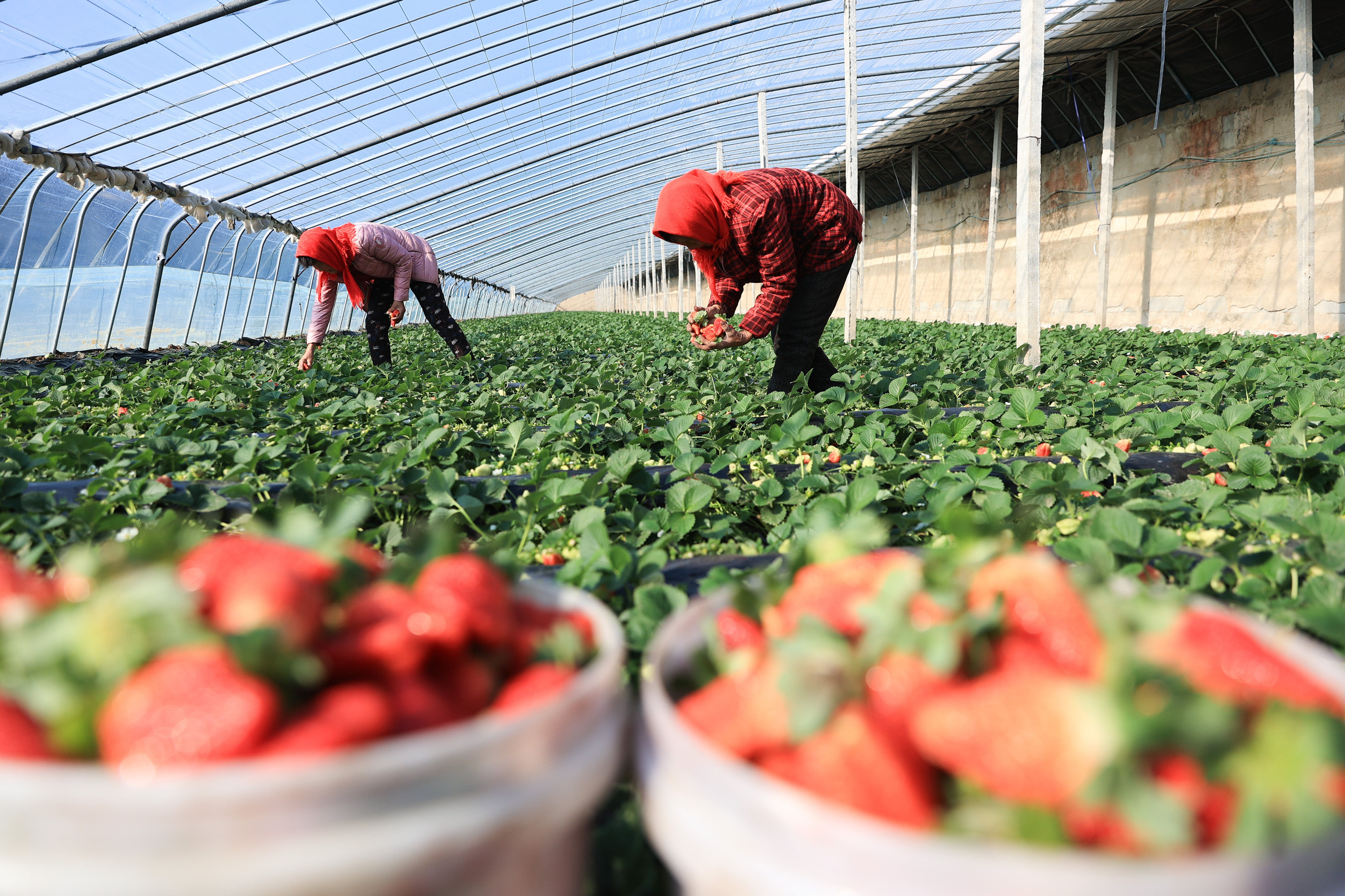 2026年1月5日,江苏省连云港市赣榆区金山镇赵湖村农民在大棚内采摘草莓。(司伟 摄)
