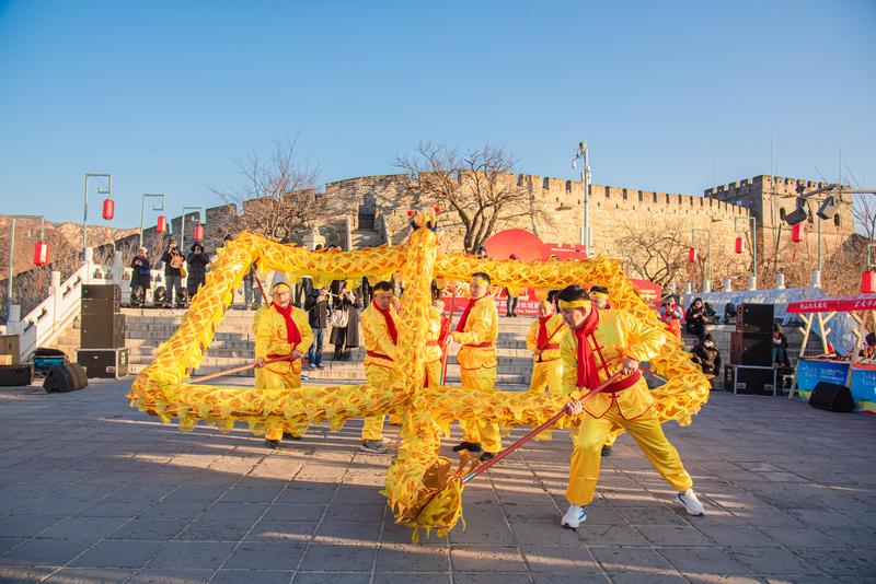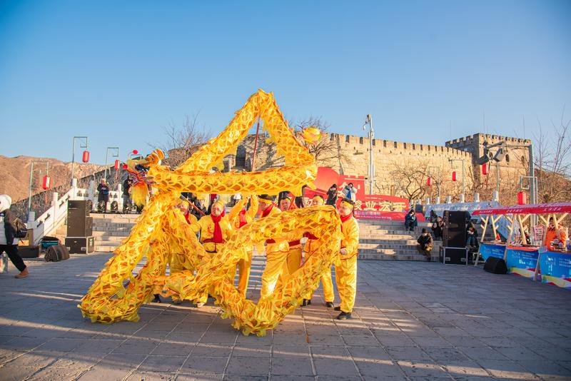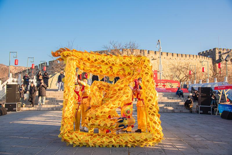 “巨龙”两度舞长城。继2025年“惊雷逐梦、梦圆长城”,2026年“以龙为媒、非遗绽放”,省级非遗玉祁龙舞两度闪耀长城。2026年1月1日清晨6时,朔风凛冽,零下15摄氏度的慕田峪长城上,铿锵鼓点划破晨雾,“玉祁龙舞”惊艳登场。金色巨龙在队员们托举下翩然舞动,昂首摆尾掠过600年斑驳城墙,队员们身手矫健、配合默契,翻腾起落间变换多种造型,将“中国龙”勇猛矫健、威仪不凡展现得淋漓尽致,舞出独属于中国人的新春浪漫。