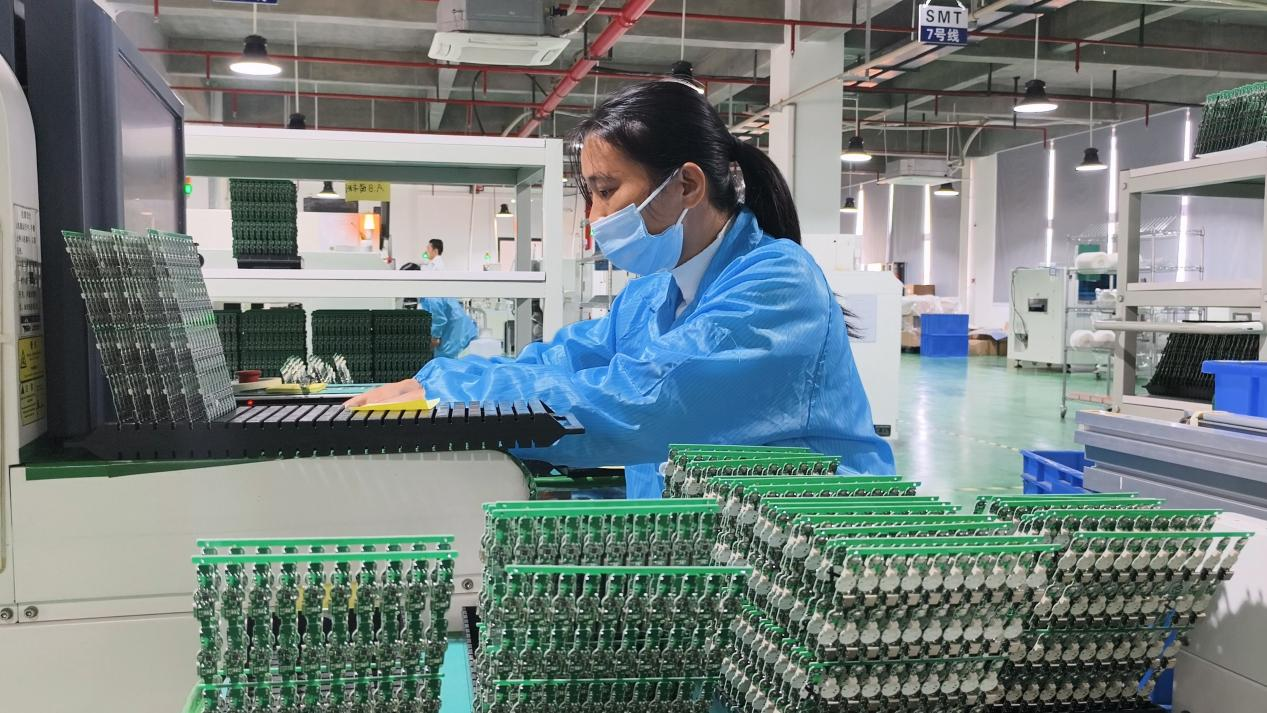 广西瑞展鑫电子科技有限公司自动生产线上,工人正在有序工作。(向国华 摄)