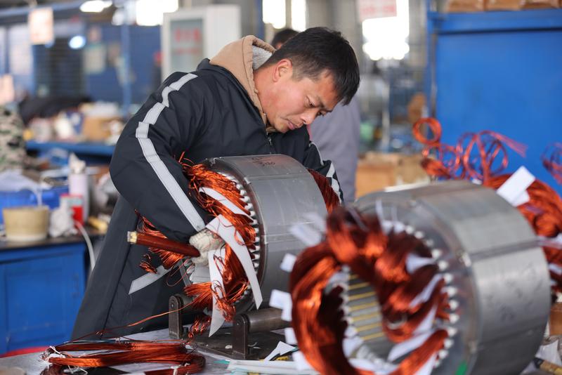 襄阳世阳电机有限公司生产车间内,工人正在加紧赶制一批出口的电机订单。(张沛 摄)