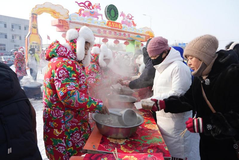 活动现场人头攒动,热闹非凡,最具人气的亮点当数雪树啤酒特别设置的“雪树大席”。8口硕大的铁锅同时开火,锅内热气腾腾,炖煮着极具东北特色的铁锅炖,浓郁的香气飘散在空气中,引得市民和游客纷纷驻足围观。雪树啤酒不仅免费供应热乎的铁锅炖,还提供“老铁啤”免费畅饮,让大家在冰天雪地里也能感受到满满的热情。