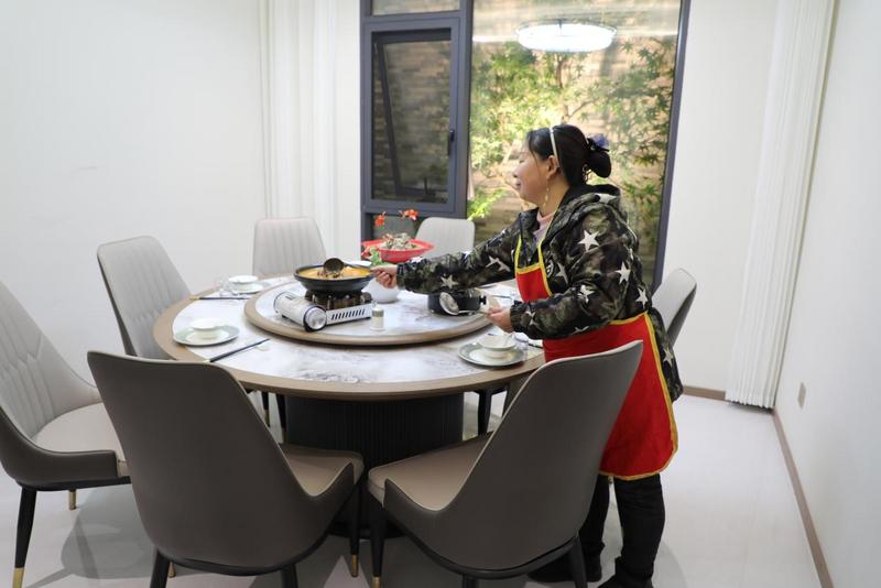 如今,这栋楼里生机勃勃。设在二、三层的12套学生公寓,让学子安心、家长放心,目前已有11套迎来了学子入住。经过精心筹备,2025年12月10日,主打乡间土菜、兼营海鲜的一层“红焱私厨”正式营业,餐厅内暖意融融:优先招聘附近的陪读家长,让她们实现“照顾孩子”“挣份工资”两不误。