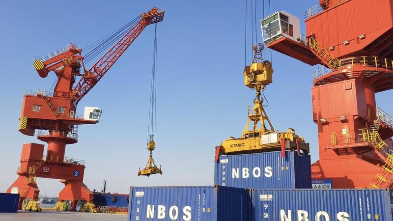 龙从码头现场,起重机长臂挥舞,锁住集装箱四角,轻轻吊起,准备装船。(向国华 摄)