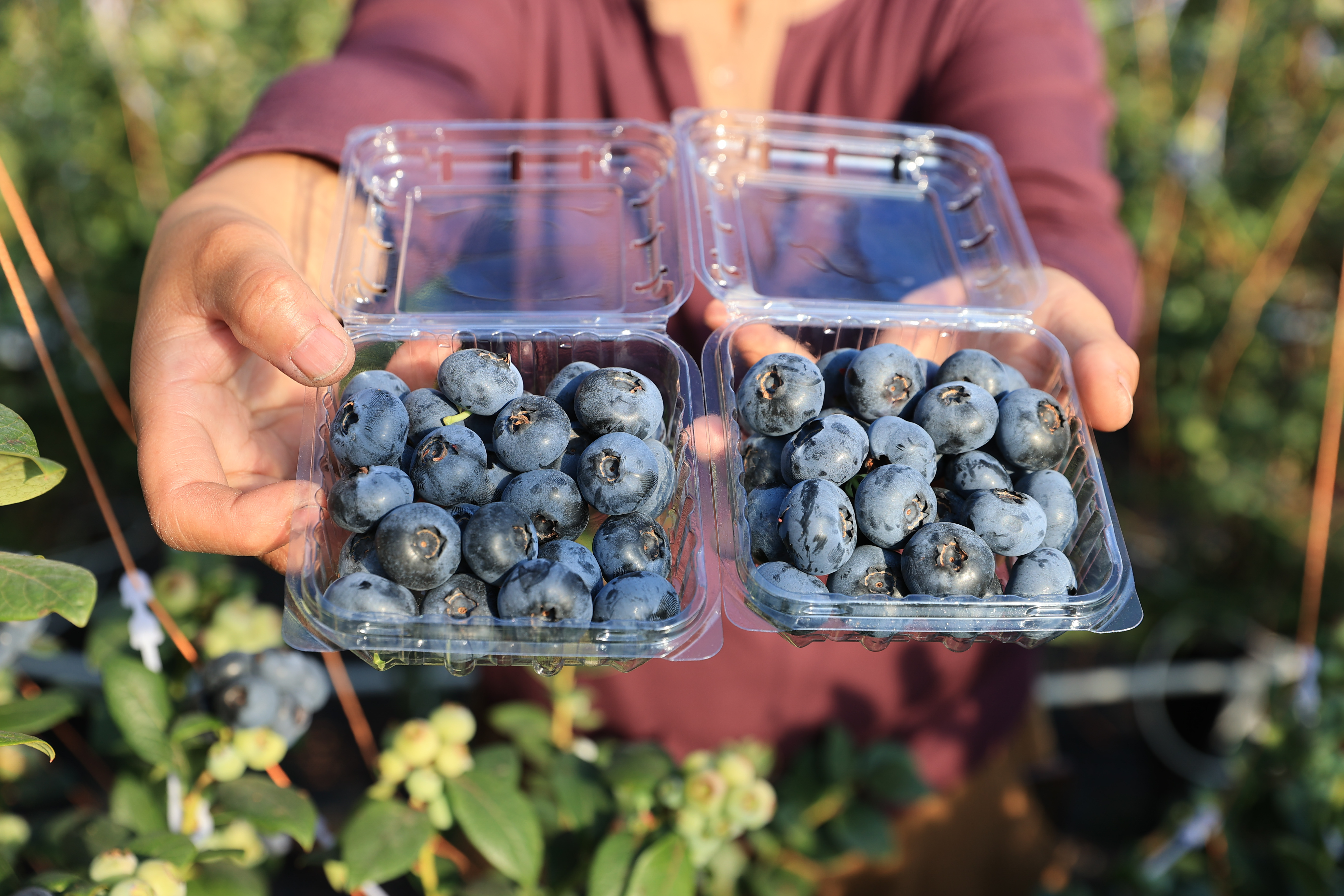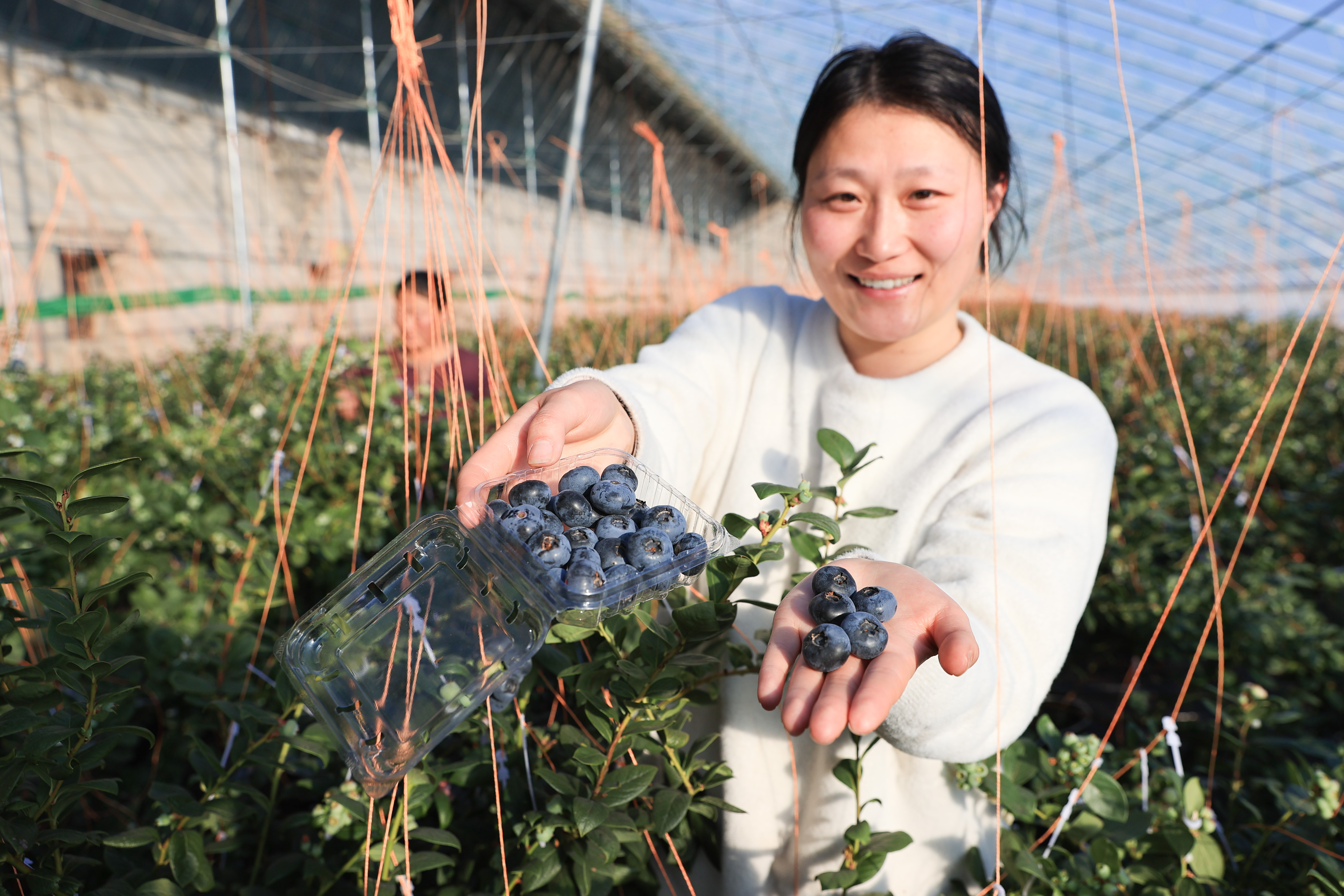 1月11日,赣榆区塔山镇墩前村蓝莓基地,果农在大棚内采摘“盆栽”蓝莓。(司伟 摄)