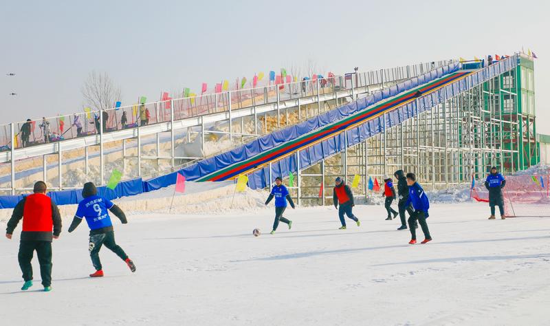 此外,冰雪乐园里不仅有孩子们童话般的感受,更可以让大人玩一场冰雪足球来体验另一种速度与激情。随着一声哨响,“奇遇杯”雪地足球赛正式开赛。4支球队身着彩色队服,在雪地上展开激烈角逐。与传统足球赛不同,雪地赛场地面湿滑,球员们时而在雪地里打滑摔倒,时而用“雪地专用防滑钉鞋”上演精准传球,技巧遇上冰雪场地,虽然还是同样的足球和队员,可收获的却是不一样欢乐。“在雪地上踢球比在草地上踢球刺激多了,非常考验技术和默契。追着球跑,也特别过瘾,特别带劲儿。下次我希望带着家人朋友一起来,愿意一起感受一下这份快乐。”游客李强表示。