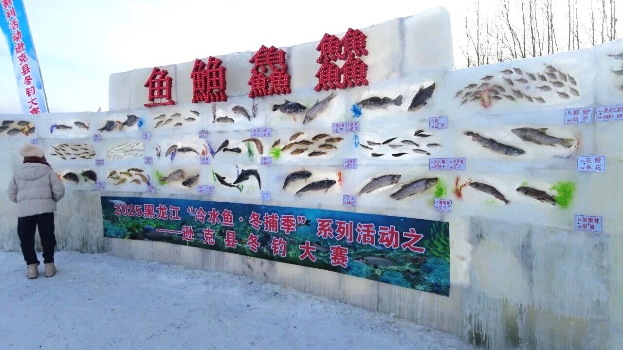 开幕式现场一侧,两大特色展区人气爆棚,成为游客驻足打卡的热门地点。在特色农产品展览区辣椒酱、蜂蜜、朗德鹅等本地特色产品整齐陈列,工作人员热情地向游客介绍产品特点;不远处的鱼类文化展示区,一面由黑龙江“三花五罗十八子七十二杂鱼”标本精心打造的冰墙格外吸睛,形态各异的鱼类标本镶嵌在晶莹冰体中,生动展现出黑龙江流域丰富的渔业资源。