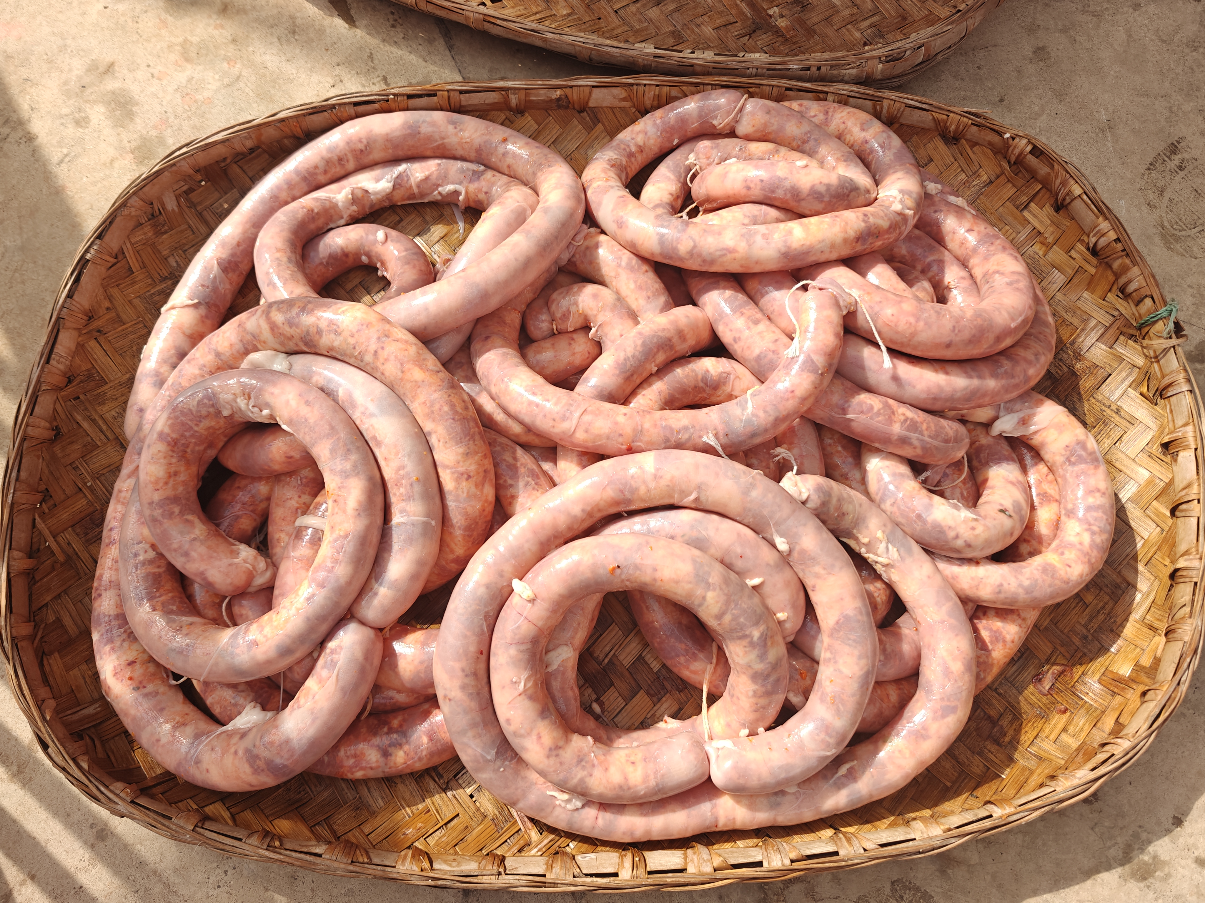 与腌制腊肉同步进行的,还有灌制香肠的活儿。一旁,几位大哥正熟练地调配香肠馅料,将肥瘦比例适中的猪肉切成小块,加入盐、辣椒、葱、姜、花椒面等调料,充分搅拌均匀。馅料备好后,就该往肠衣里灌了。有人手持提前泡软的猪肠衣,将其一端套在特制的灌香肠工具上,另一端用棉线扎紧;有人负责往工具里添馅料,还有人双手轻轻握住肠衣,随着馅料的注入慢慢向前推送,同时用手轻轻拍打肠衣,排出里面的空气,避免煮的时候破裂。灌好一段后,就用棉线每隔一段扎一个结,分成均匀的小段,再用针在肠衣上扎几个小孔,进一步排出残留的空气。灌香肠关键要松紧适度,太松煮出来会散,太紧口感不好。粉嘟嘟的香肠盘在簸箕上,透着新鲜的肉香,格外诱人。还有用豆腐和新鲜猪血、猪油混合搅拌制作成的会东特色美食血豆腐。