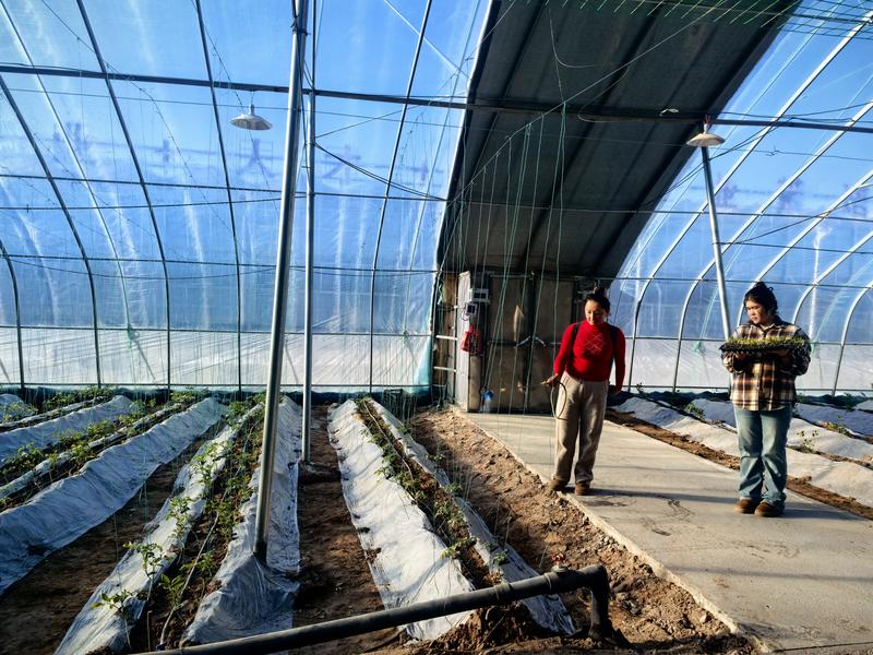 柯坪县绿色戈壁设施农业产业园,工作人员在温室大棚里维护菜地。(查燕荣 摄)