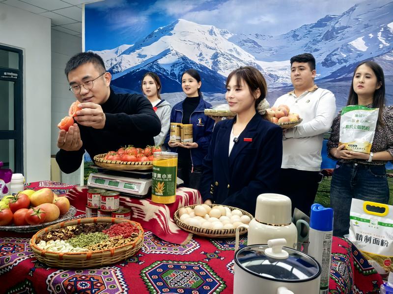 新疆柯小驼电子商务科技有限公司的直播间里,工作人员正在销售产业园的沙瓤西红柿。(查燕荣 摄)
