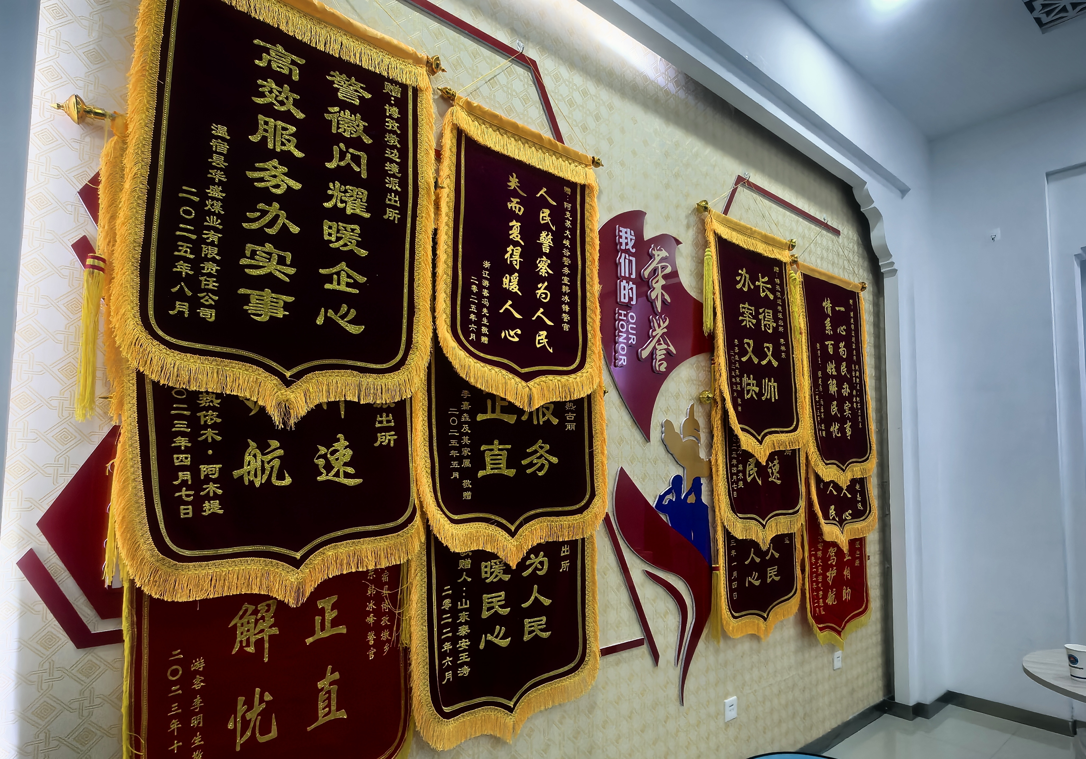 图为在大峡谷边境旅游警务驿站内,墙上的一面面锦旗格外醒目。(查燕荣 摄)