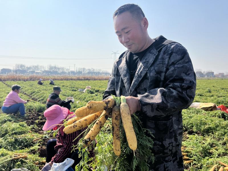 冬日暖阳下,湖北省应城市黄滩镇龙口村的200余亩胡萝卜田里,一片橙黄鲜亮。村党支部书记、村委会主任李剑鹏正俯身查看泥土中饱满的果实。