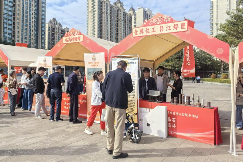 1月20日,儋州市那大镇文化公园广场彩旗飘扬、人声鼎沸,海南省2026年春风行动暨就业援助季首场大型服务活动在这里开启。临高县携带“琼筑劳务—金牌住工”“临高烤猪师”两张“就业金名片”应邀而来,在活动中亮出临高特色、讲好临高就业故事。