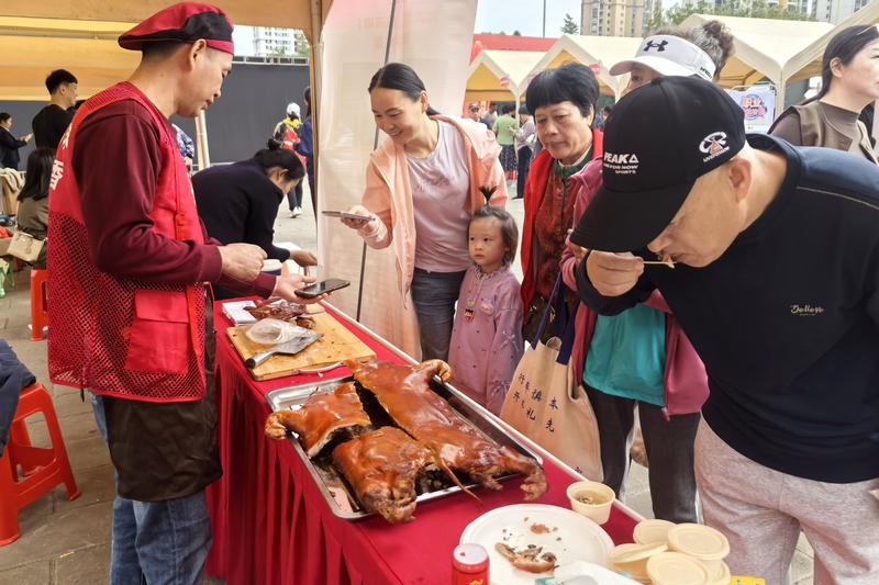市民游客在“临高烤猪师”展区交流、品尝(骆金梅 摄)