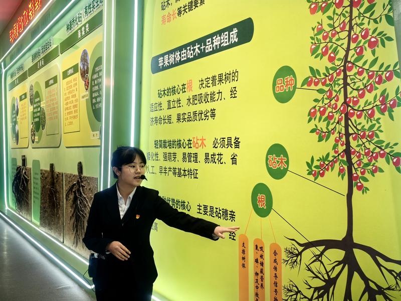 阿克苏苹果科技馆工作人员正在讲解苹果栽培与砧木的关系(查燕荣 摄)