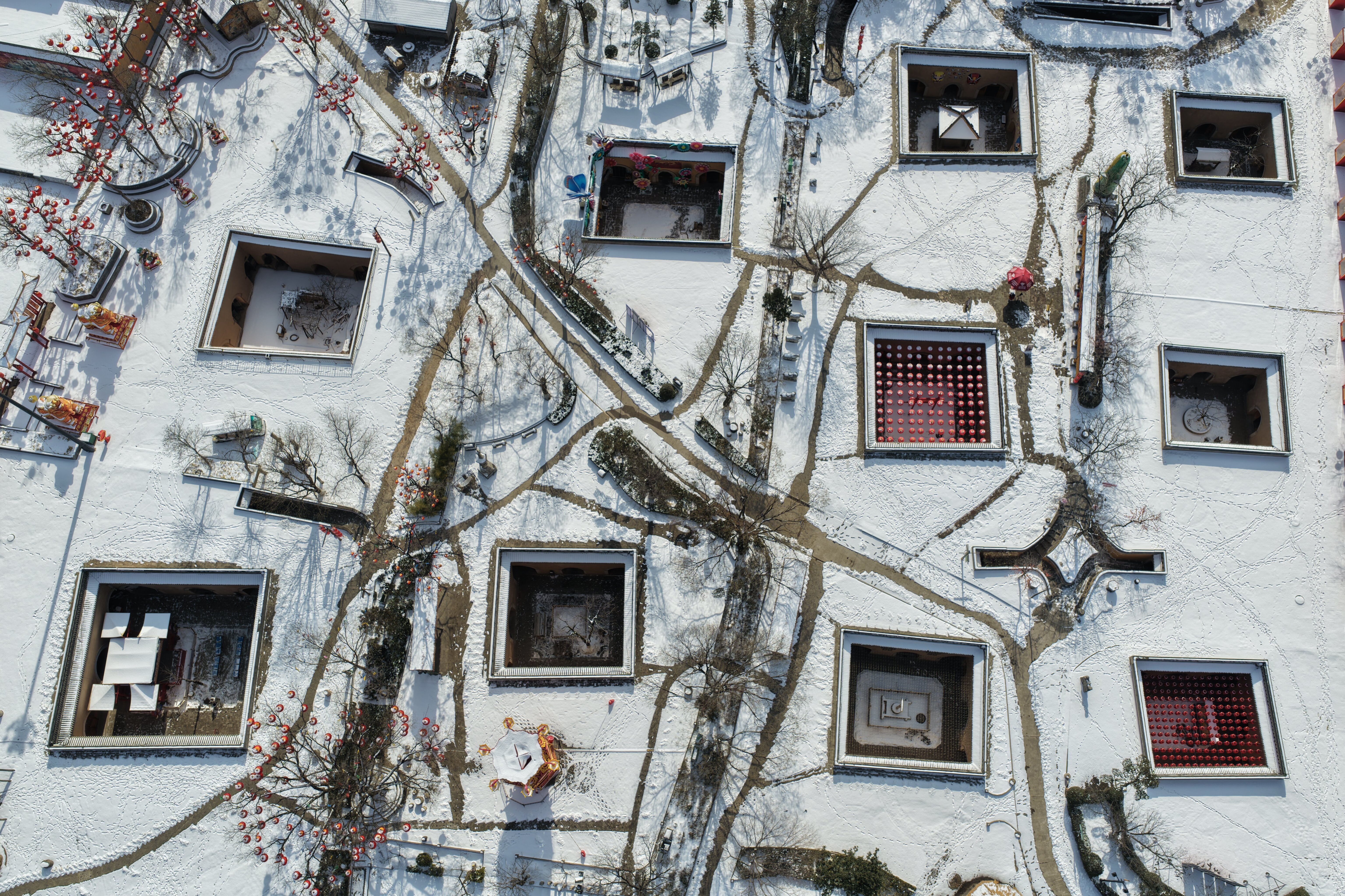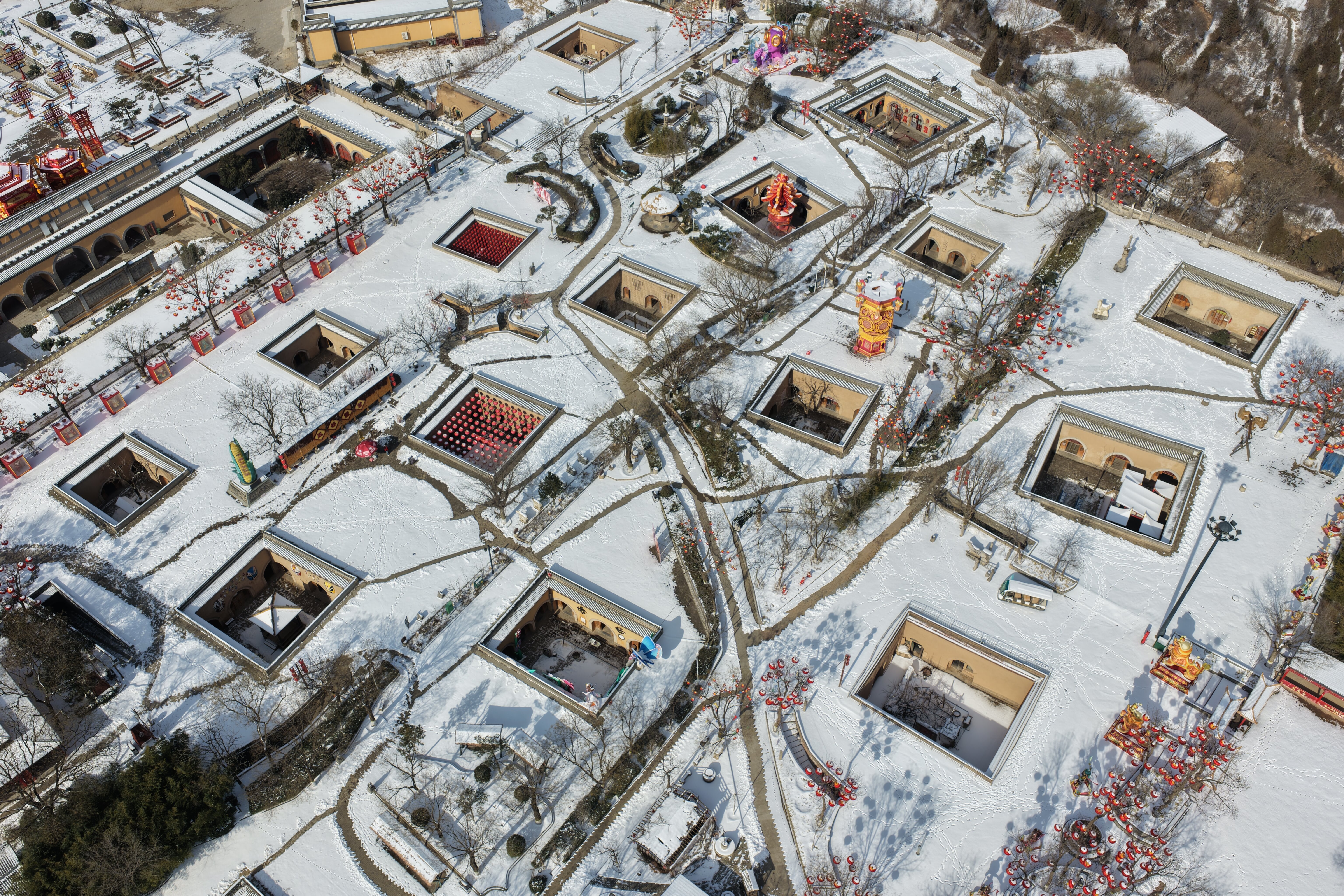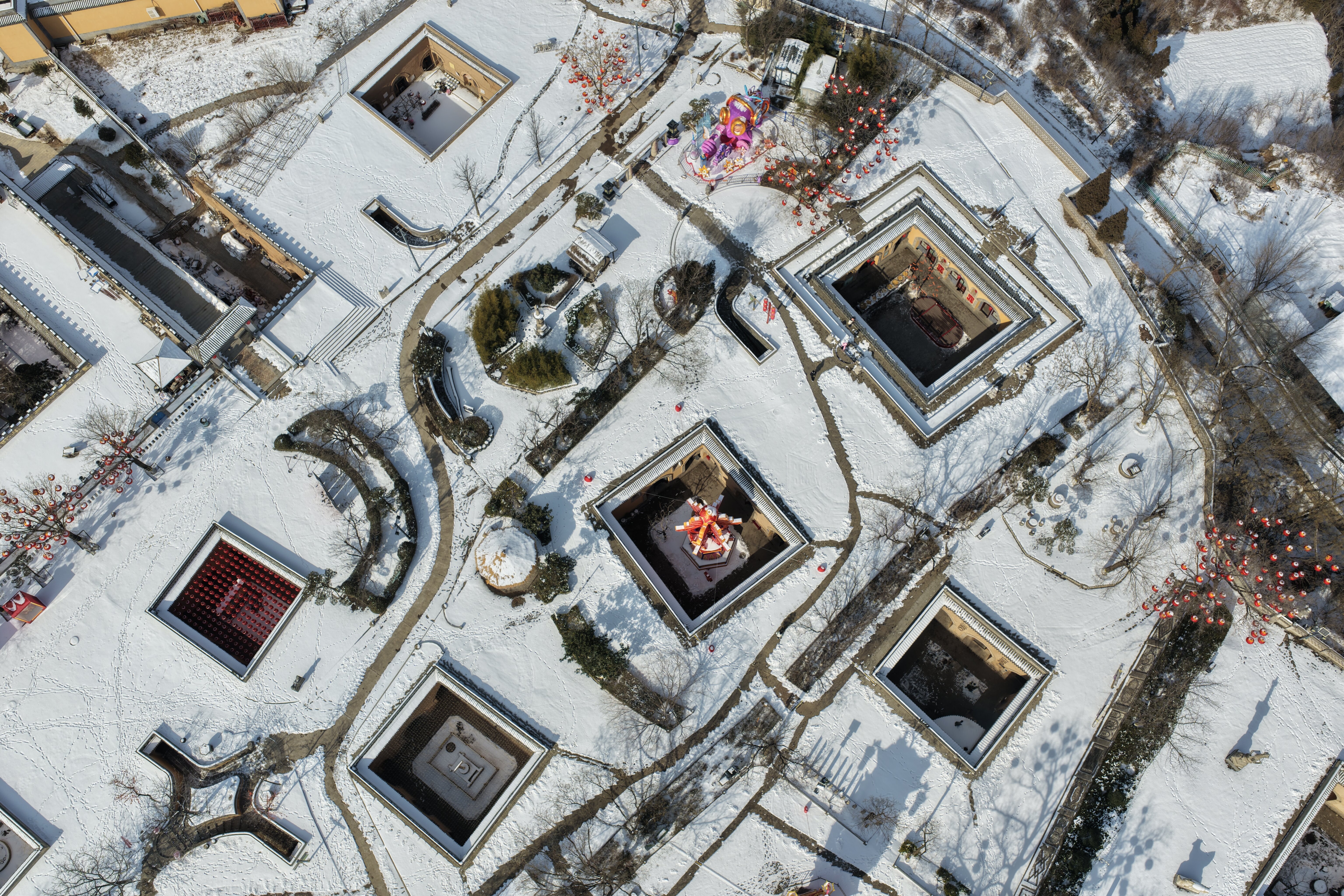 1月21日,雪霁初晴,河南省三门峡市陕州地坑院银装素裹,白雪将一座座地坑院勾勒成寓意团圆的“回”字,深情呼唤华夏儿女回河南老家过大年,赓续乡土文脉,共绘和美乡村年味图景。(记者 李向东)