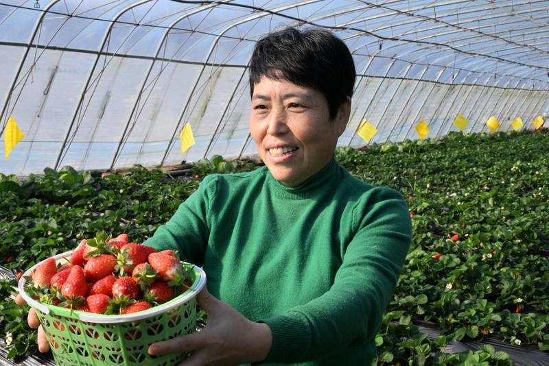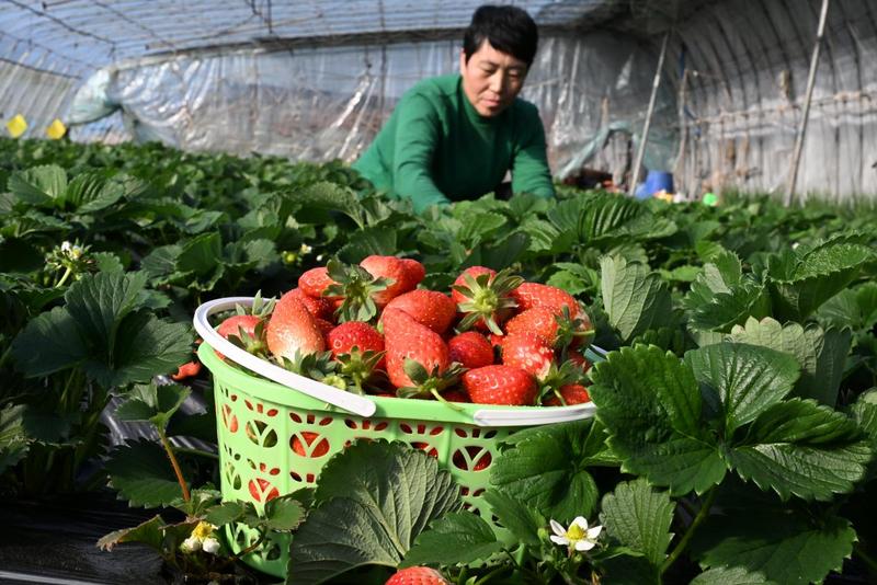 山东省青岛市即墨区灵山街道索戈庄村农民在大棚内采摘草莓(张涛 摄)
