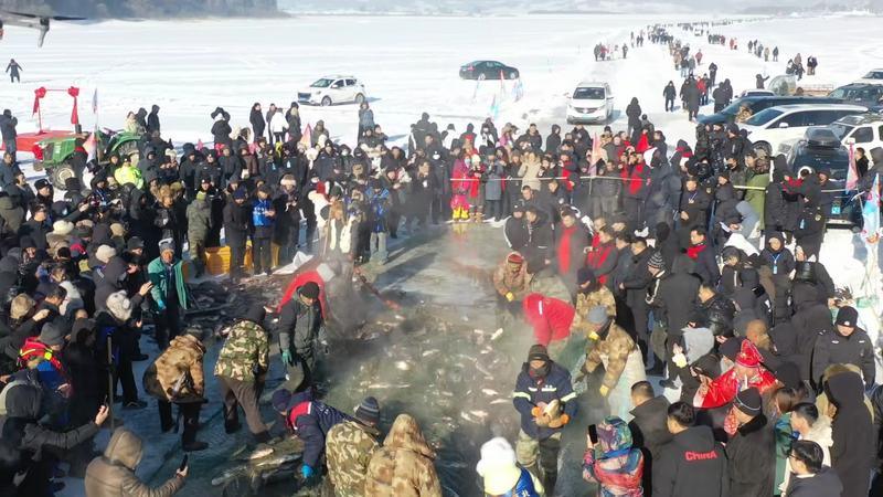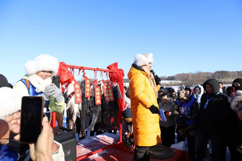 伴随着渔把头高亢激昂的拉网号子,巨网裹挟着阵阵水汽,从出鱼口缓缓而出,水汽瞬间凝成白雾,渔网内鱼群跳跃,鲤鱼、草鱼、胖头鱼等竞相跃出冰面,勾勒出一幅传承千年的渔猎画卷。这一网鲜鱼,不仅凝聚着自然的慷慨馈赠,更是千年渔猎文明的生动延续。“冰湖腾鱼”的震撼场景惊艳全场,游客们纷纷拿出手机、相机记录这难得一见的盛景,留下“年年有余”的美好寓意。