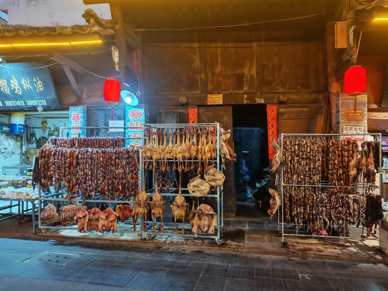 来到西街、邮政街,年味扑面而来,香肠红润,腊肉透亮,血豆腐圆润饱满,一串串、一排排悬挂在屋檐下,织成一道独特的年味风景。