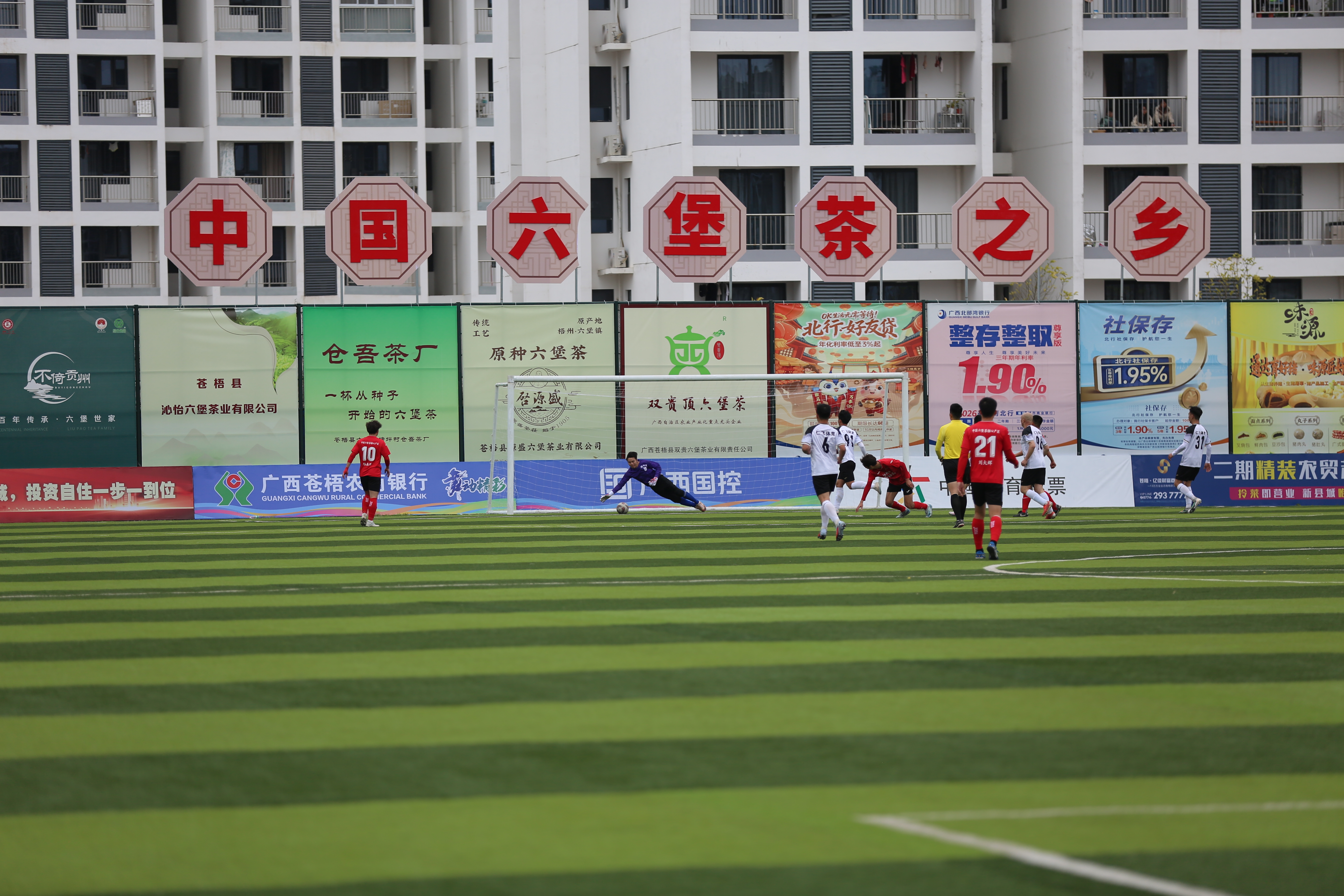 “球进了!”1月31日,广西壮族自治区梧州市苍梧县石桥镇东安社区体育休闲公园足球场爆发出雷鸣般的欢呼。梧州市苍梧县六堡茶队抓住进攻契机,团队间流畅配合,队员接球后顺势破门得分。