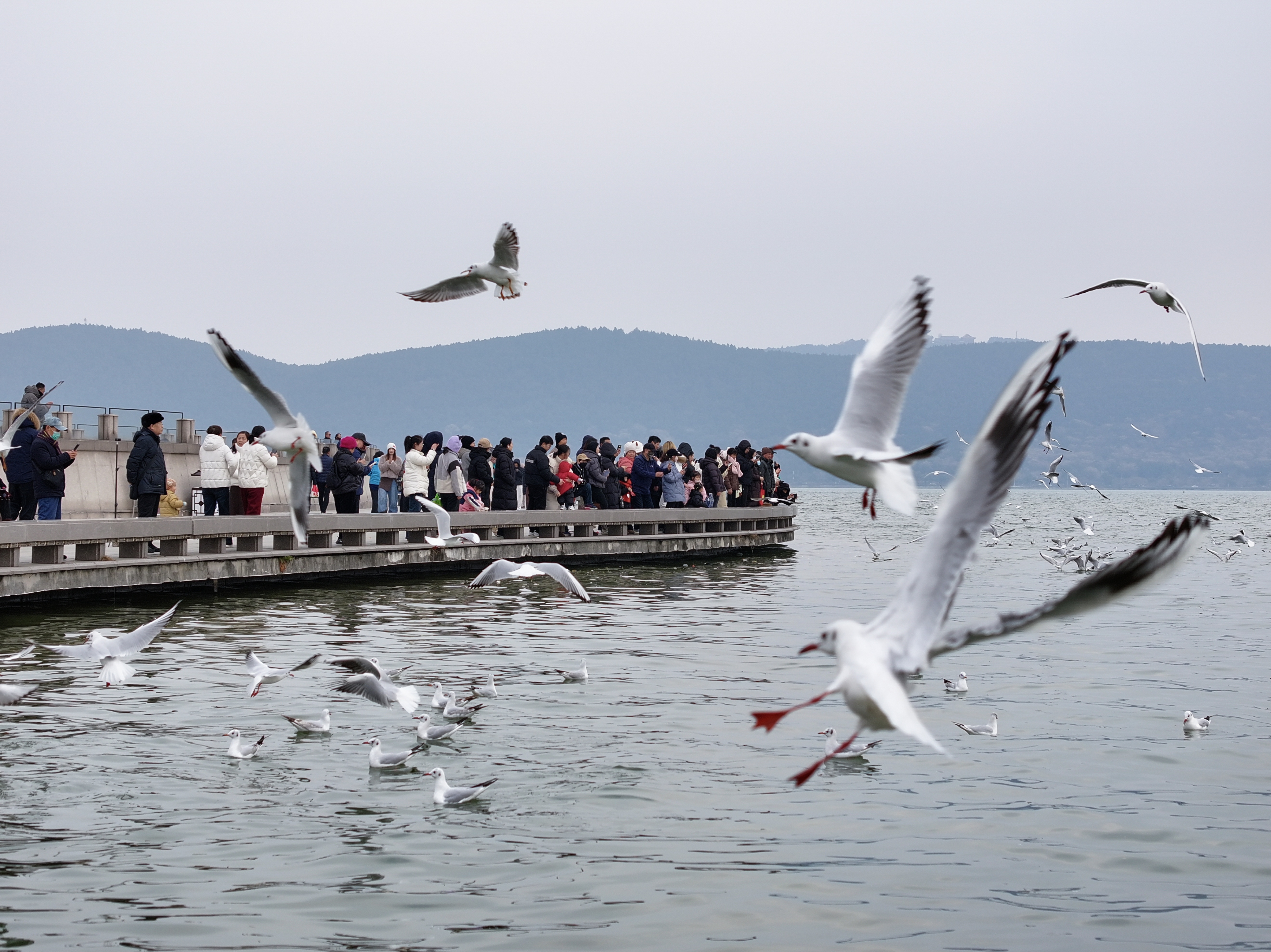 2026年1月30日,冬日的江苏省徐州市云龙湖海鸥翔集,市民争相投喂打卡,绘就人与自然和谐画卷。(记者 张伟伟)