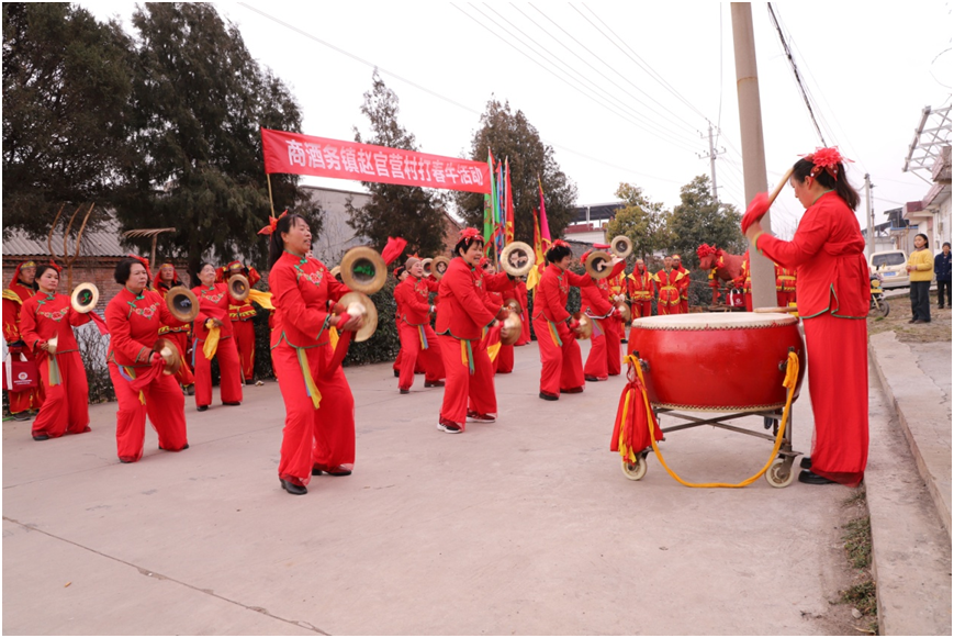 “打春牛”伊始,在赵官营村的稷祖庙前,民间艺术队伍表演的旱船、跑驴、花棍舞、扇子舞、经担舞、秧歌舞等传统舞蹈,吸引围观群众驻足观看。之后,参加“打春牛”民俗活动的村民打着横幅、用平板车载着用泥糊制的“春牛”、肩扛着“打春牛”工具,敲锣打鼓,来到了赵官营村北的麦田里,鞭打“春牛”。