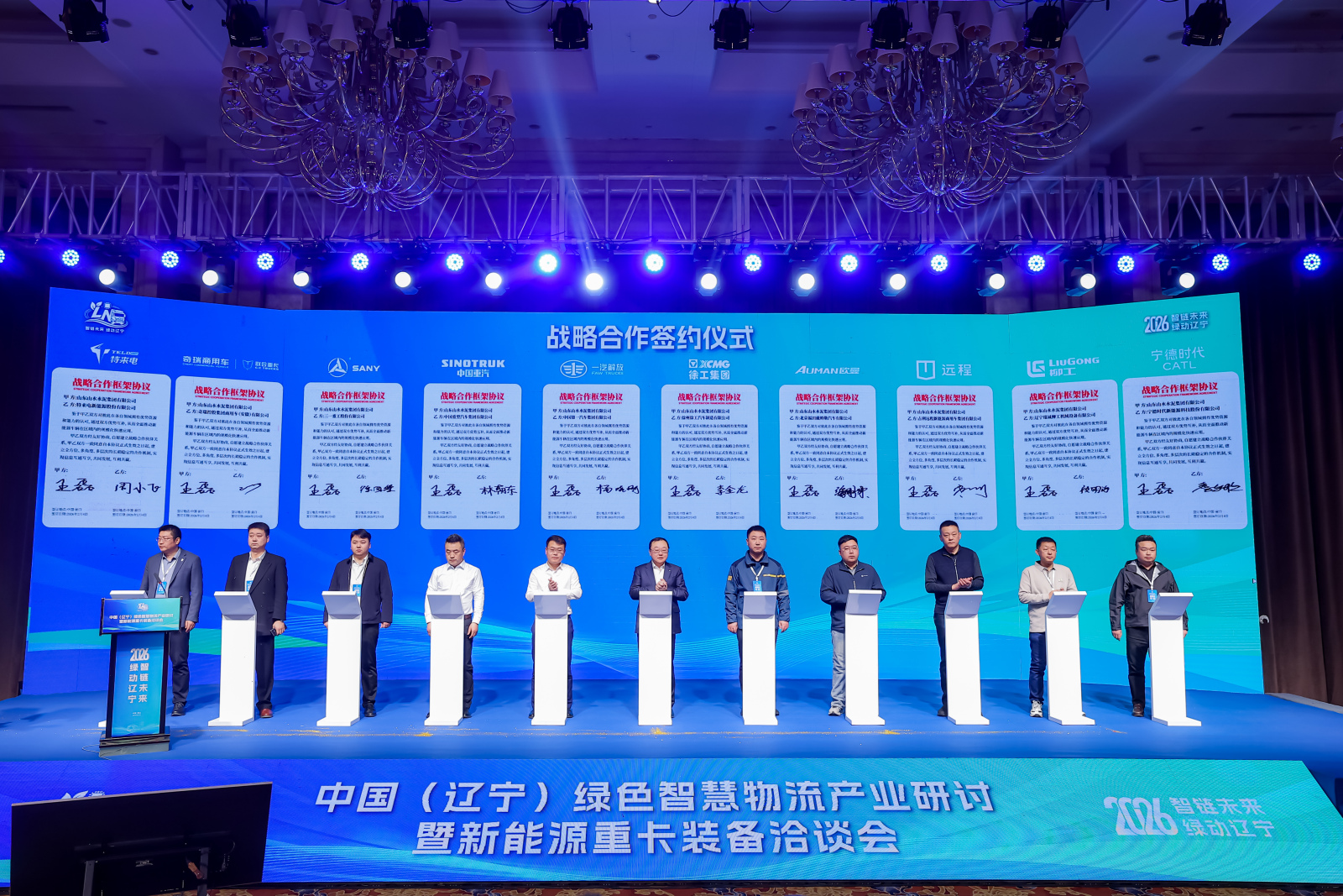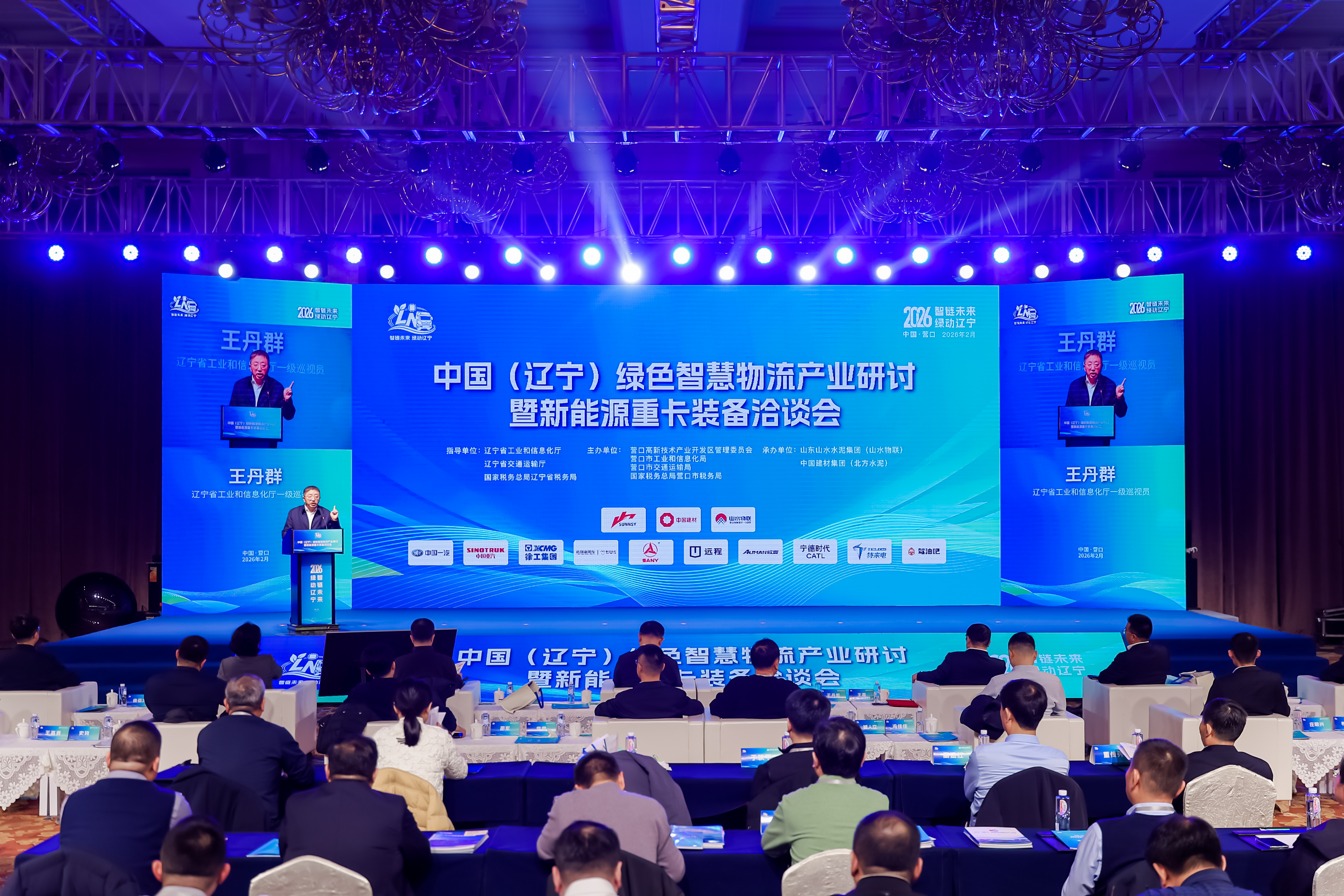 2月4日,中国(辽宁)绿色智慧物流产业研讨暨新能源重卡装备洽谈会在辽宁省营口市召开。本次会议以“智链未来、绿动辽宁”为主题,会议由辽宁省工业和信息化厅、辽宁省交通运输厅、国家税务总局辽宁省税务局指导,营口高新技术产业开发区管理委员会等单位主办,山东山水水泥集团有限公司(辽宁山水通途物联智能科技有限公司)和中国建材北方水泥有限公司承办。业内相关领导以及各协会、院校、企业嘉宾近300人参会。