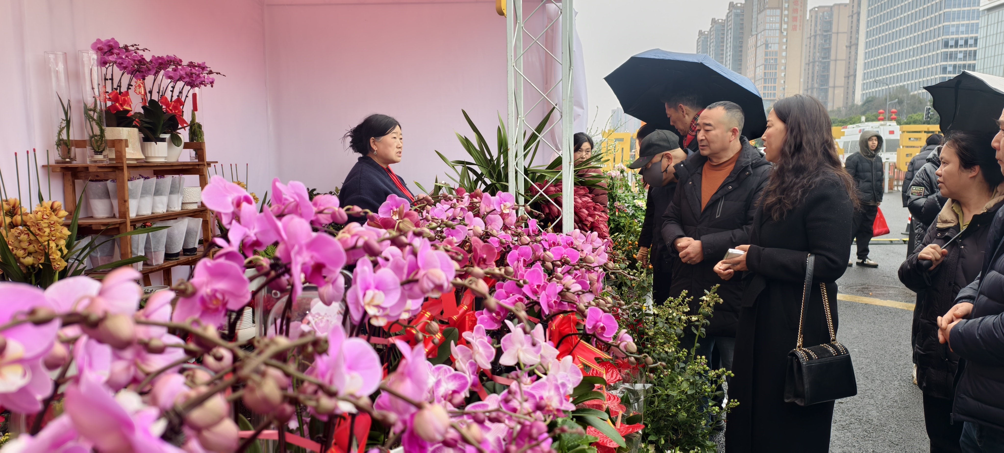 春节前夕,正是年宵花旺季,花卉摊位前,以蝴蝶兰、大花蕙兰、银柳为代表的传统年宵花吸引众多市民游客驻足挑选。