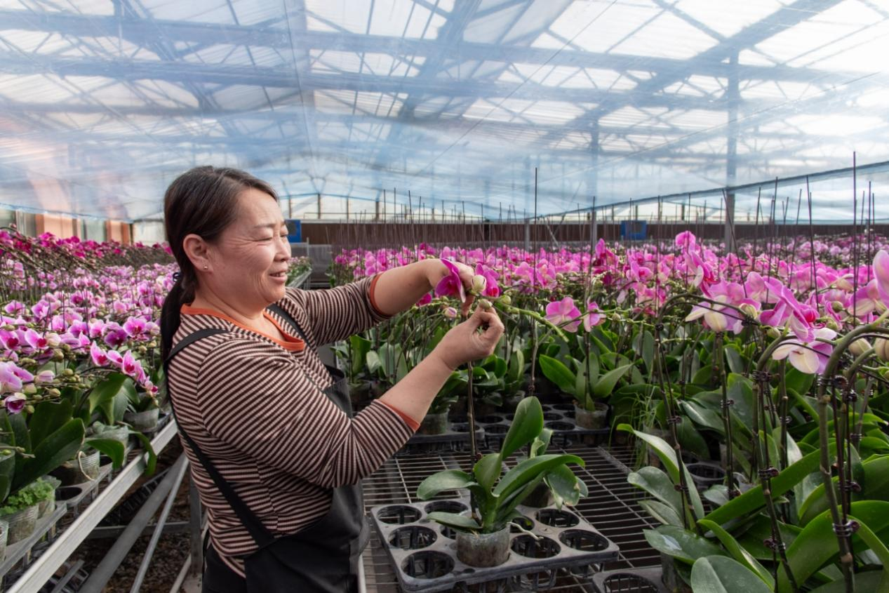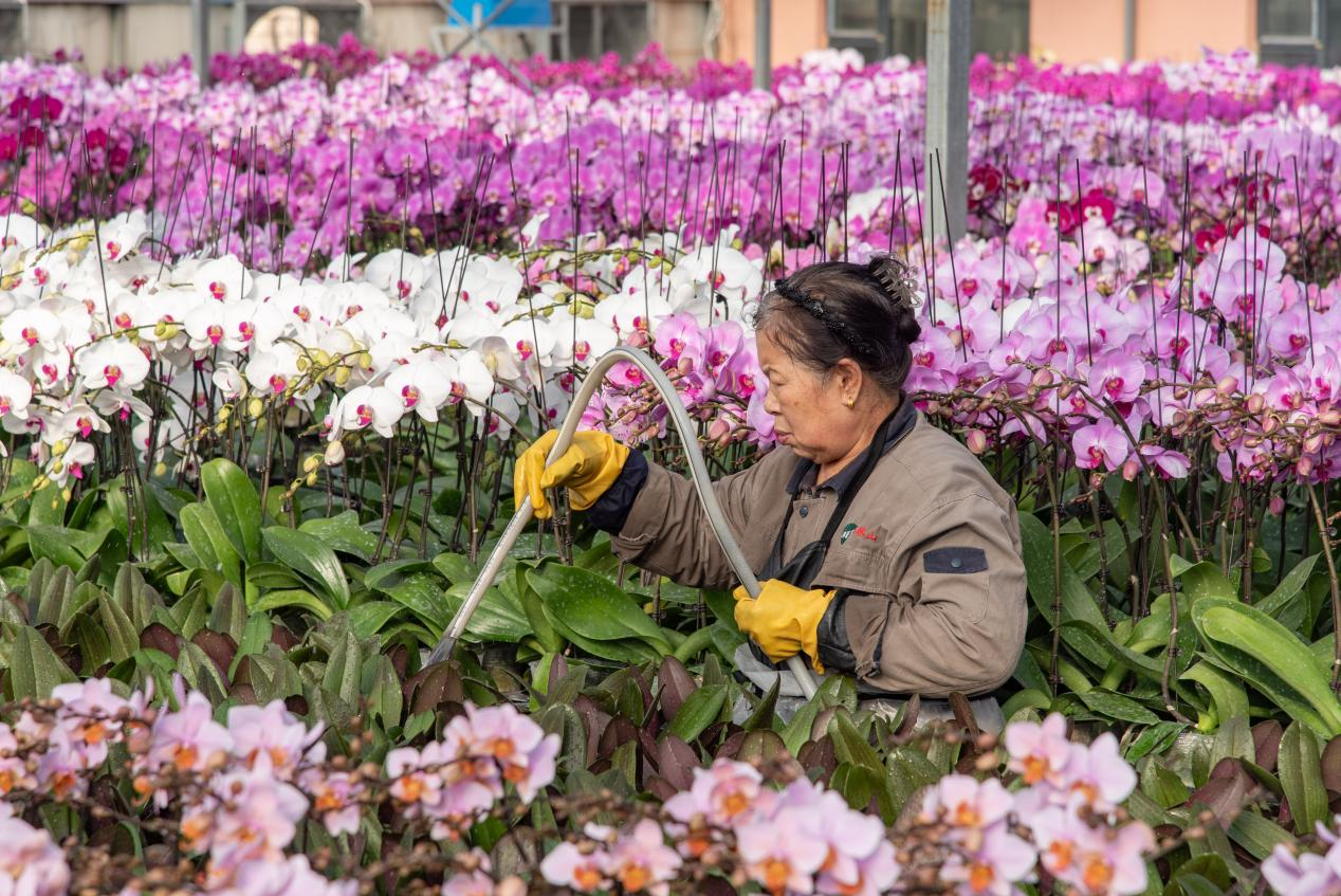 蝴蝶兰的培育温室内,智能系统正静静调节着温湿度与光照。负责人史东阳穿梭在花丛间,仔细查看长势。“这批订单赶着春节市场,要确保每一株都姿态完美。”他介绍道。自2009年起步,村里通过与企业深度合作,建起5座总面积达2万平方米的现代化温室,形成了从组培育苗到成花销售的完整产业链。科学精细的环境控制,不仅让“杨家窑兰花”品质稳定、香飘京津冀乃至更远市场,更重要的是为周边20余名村民提供了稳定的就业岗位,让这份“美丽事业”实实在在地鼓起了乡亲们的钱袋子。