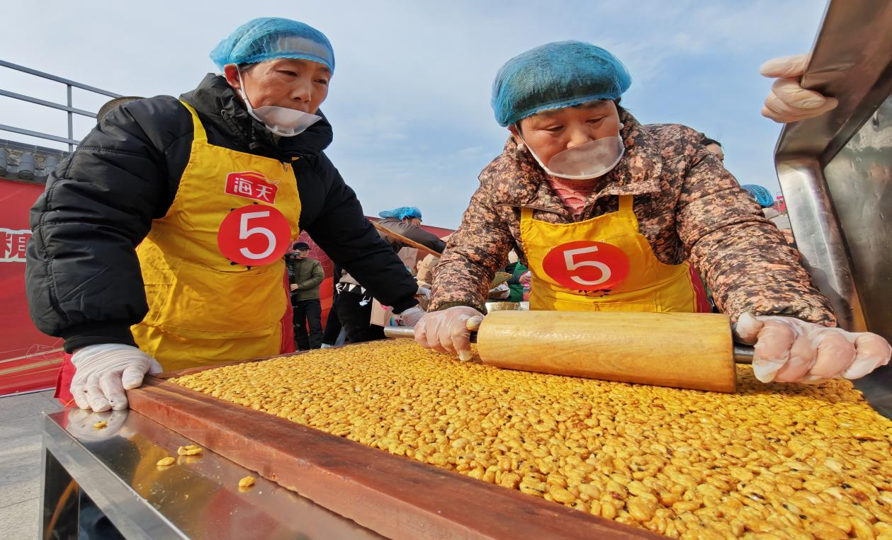 “搌糖”承载着当地人几代人的记忆,是春节不可或缺的“甜蜜符号”。赛场之上,选手们凝神聚力、有条不紊。大家精准把控火候,手中工具不停搅拌,看着锅中的糖稀从稀薄变得浓稠、从微黄转为晶莹。塑形环节,选手们熟练地拿出提前备好的花生米、白芝麻等辅料,有条不紊地开启创作。阵阵甜香随风飘散,引得群众频频驻足围观,不少人拿出手机记录下这热闹的场面。