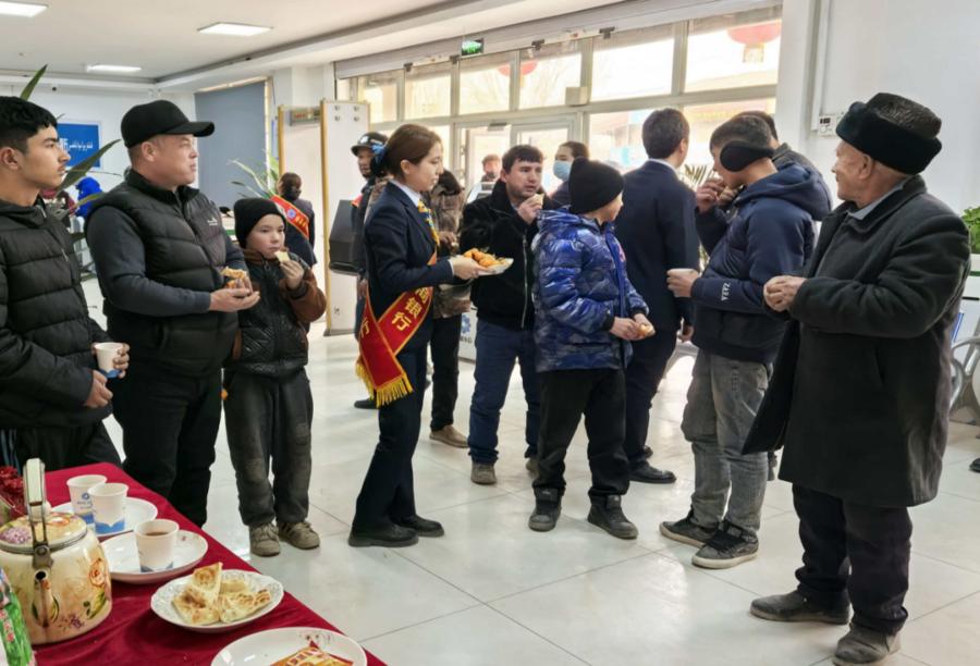 巴合齐乡的营业网点为来办理兵团社保卡的乡亲提供茶水和零食 (陈志军 摄)