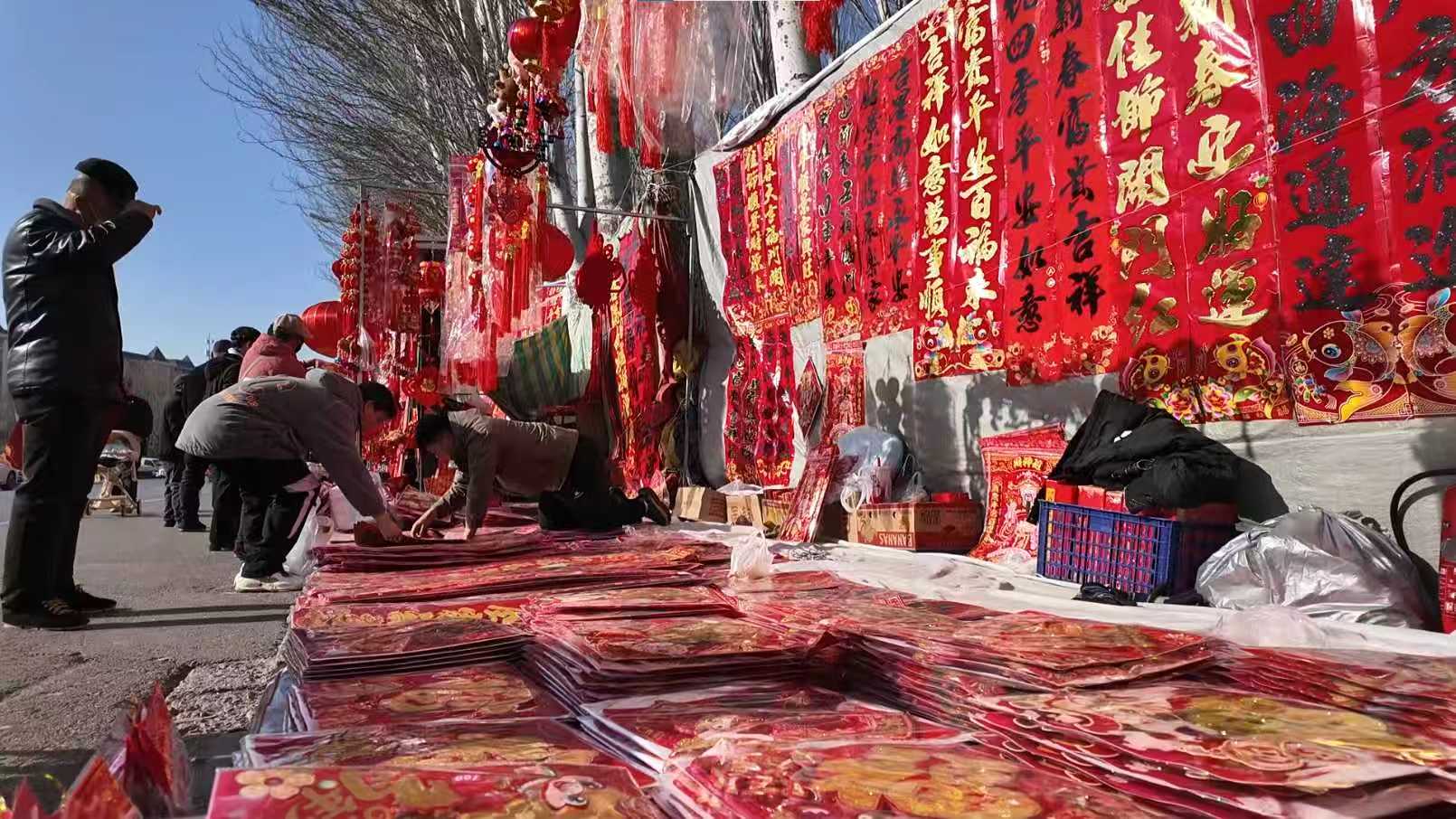 临时摊位分布于县城及德胜片区多处便民点位,涵盖县城内东方嘉园南门口、惠泽园东门口、兰山公园南门、太阳城夜市北侧等多个点位,还有德胜片区天鹅湖小镇西门、海亮五号地小广场、派胜沁园南门、德胜花园东门等各核心居住板块,让居民无需远行,在家门口就能一站式选购春联、干果礼盒等年货。