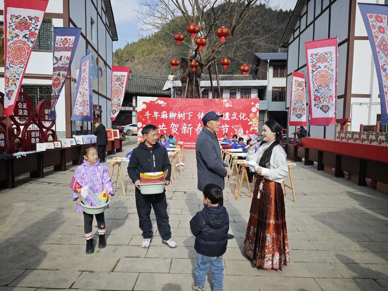 当天,还围绕麻柳刺绣、古树保护及生活安全知识等主题进行了有奖问答。主持人提问的话音刚落,现场群众便纷纷举手、踊跃抢答,答对问题的群众接过奖品时喜笑颜开,现场欢呼声、掌声此起彼伏,互动氛围热烈十足,年味也愈发浓厚。