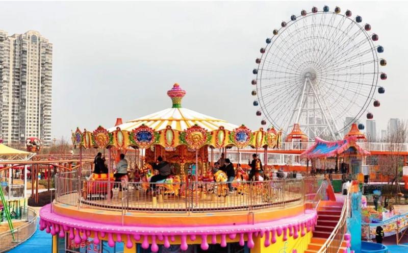园内,一座65米高的摩天轮缓缓转动,将一个个兴奋的家庭送上高空。4岁的小朋友曾予书趴在轿厢窗前,满眼好奇、惊喜连连。从高空俯瞰,园区色彩缤纷、分区鲜明,如同童话绘本铺展在城市之中,蜿蜒步道上游人如织,欢声笑语不断,远处高楼与绿意相映,一幅宜居宜乐的城市新画卷尽收眼底。