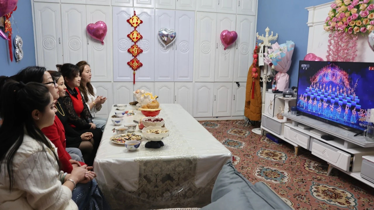 除夕夜的库车,处处洋溢着节日的喜庆氛围。在城南街道禧源社区居民穆太力普·艾合买提家中,桌上摆满了库车大馕、馓子、瓜子和各类干果,他邀请了邻居一起在家过年,随着春晚拉开帷幕,热气腾腾的饺子端上了桌,大家围坐在电视机前,一边品尝美食,一边等待着龟兹乐舞的高光时刻。