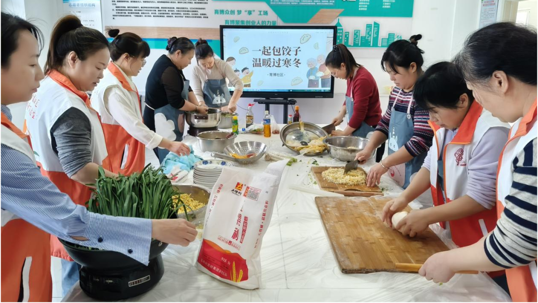 育博社区工作人员与居民一起包饺子(鞠鑫淼 摄)
