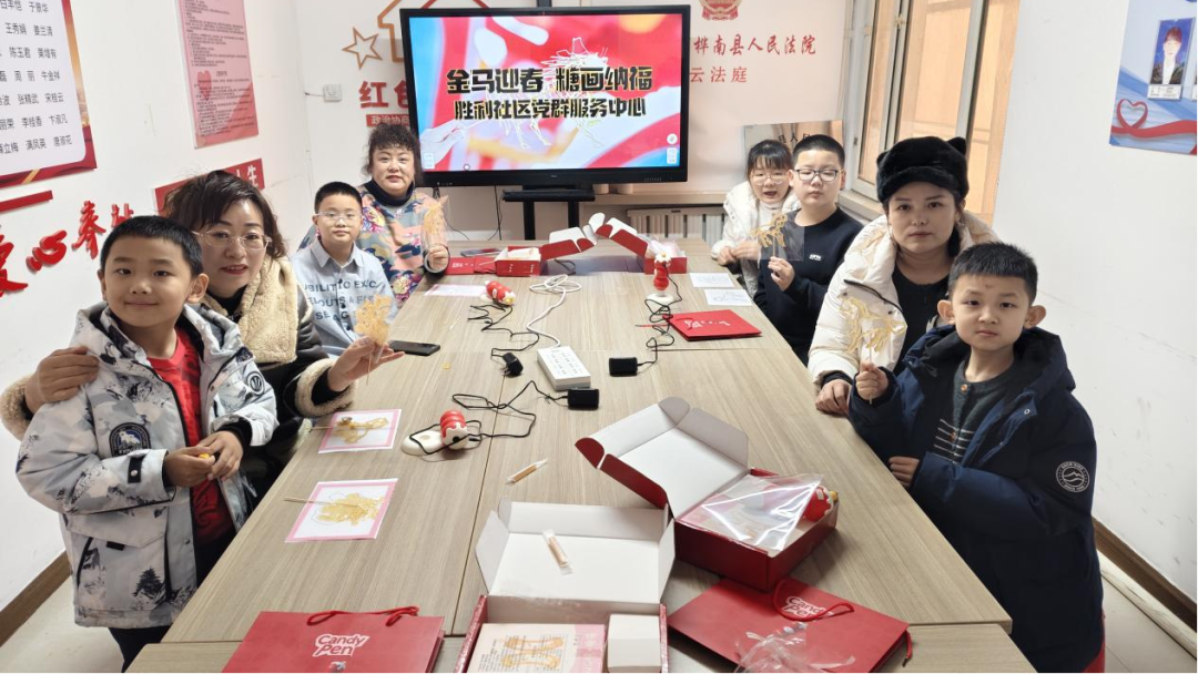 将传统文化传承与邻里温情传递相结合,创新打造特色文化体验活动,让传统年俗在新时代焕发新光彩,也让居民在互动体验中感受浓浓年味、增进邻里情谊。在胜利社区开展“糖画绘福”非遗体验活动中,亲子家庭携手合作,以糖为墨、以勺为笔,绘制出各式各样的甜蜜糖画图案,孩子们在趣味体验中近距离触摸非遗文化魅力,亲情也在协作中不断升温。与此同时,社区慰问小分队同步行动,将福字与生活物资送到辖区困难家庭手中,实现文化韵味与人情温暖的双向奔赴。