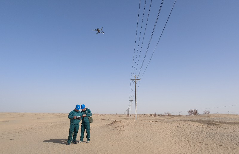 2月18日,国网和田供电公司工作人员运用无人机对沙漠地带线路进行巡视。(阿卜杜克热木·麦麦提尼亚孜 摄)