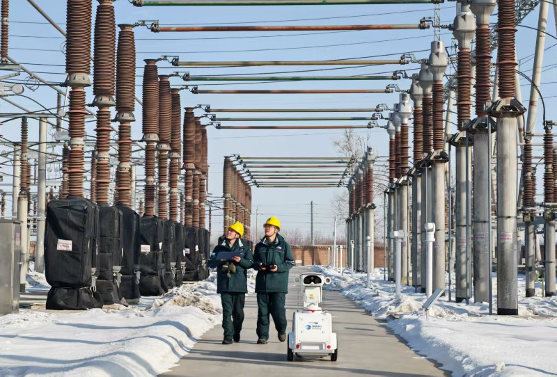 2月19日,国网昌吉供电公司工作人员在昌吉市220千伏长宁变电站通过“人工+机器人”方式巡检变电站设备。(蒋淮丞 摄)