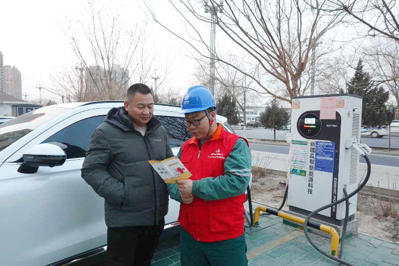 2月22日,国网巴州供电公司工作人员在库尔勒市都市春天停车场巡检新能源汽车充电桩,并向车主宣传安全用电知识。(卢小银 摄)