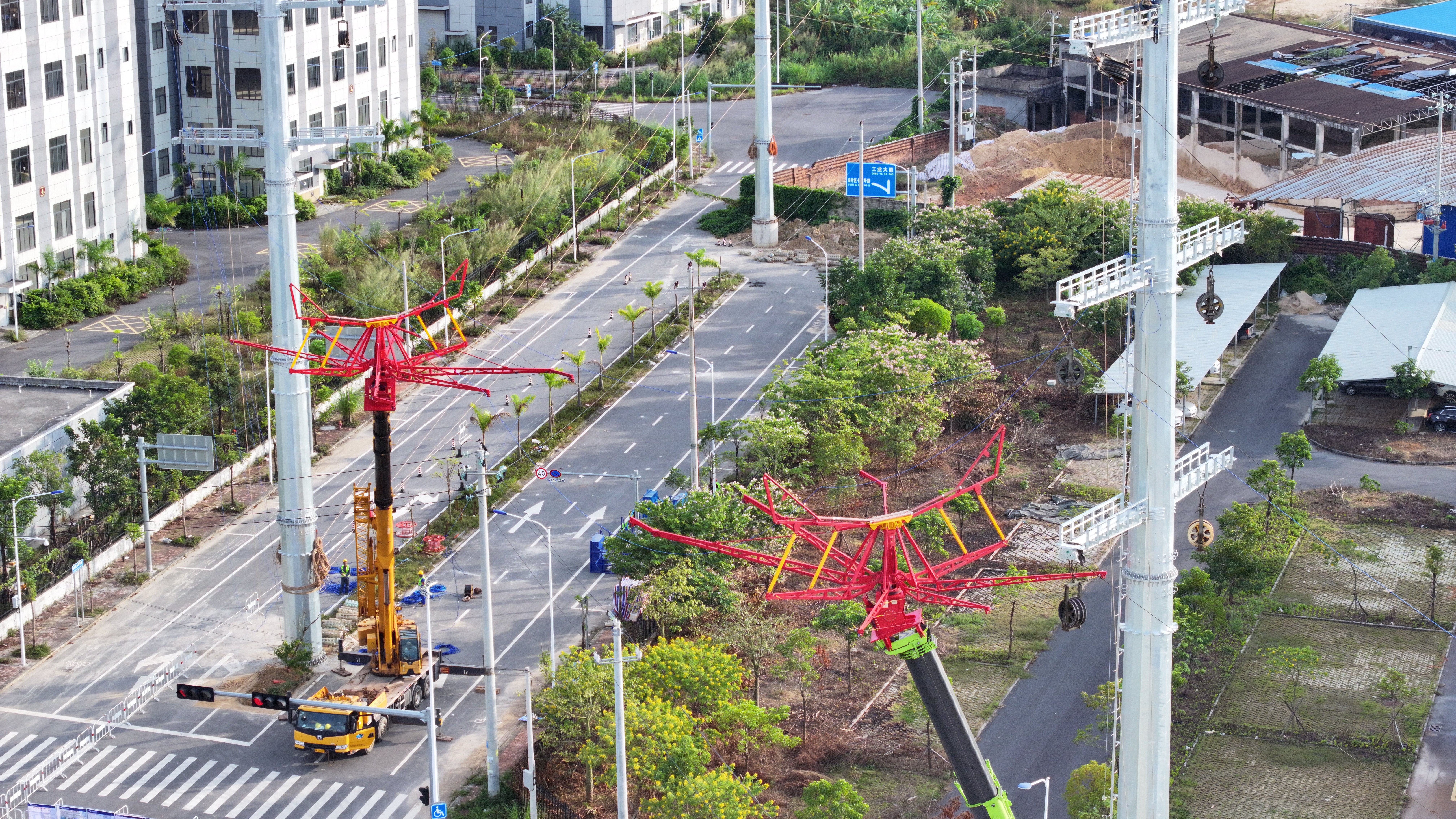 在玉林北流220千伏建陶送变电工程,应用“移动式伞形跨越架”开展线路封网跨越作业(韦迪 摄)