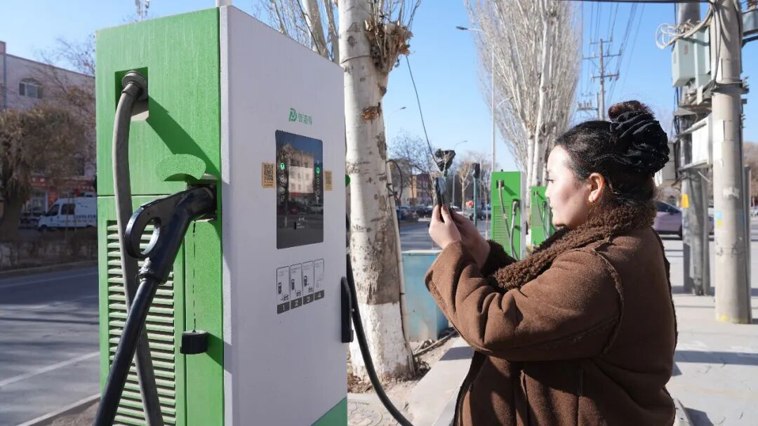 在柯坪县人民医院南门停车场,居民依扎提古丽·艾拜正熟练地扫码为新能源汽车充电。她高兴地说:“现在全县都有充电站,扫码就能充,速度也很快,不用等太久就能满电出发,真的太方便了!”