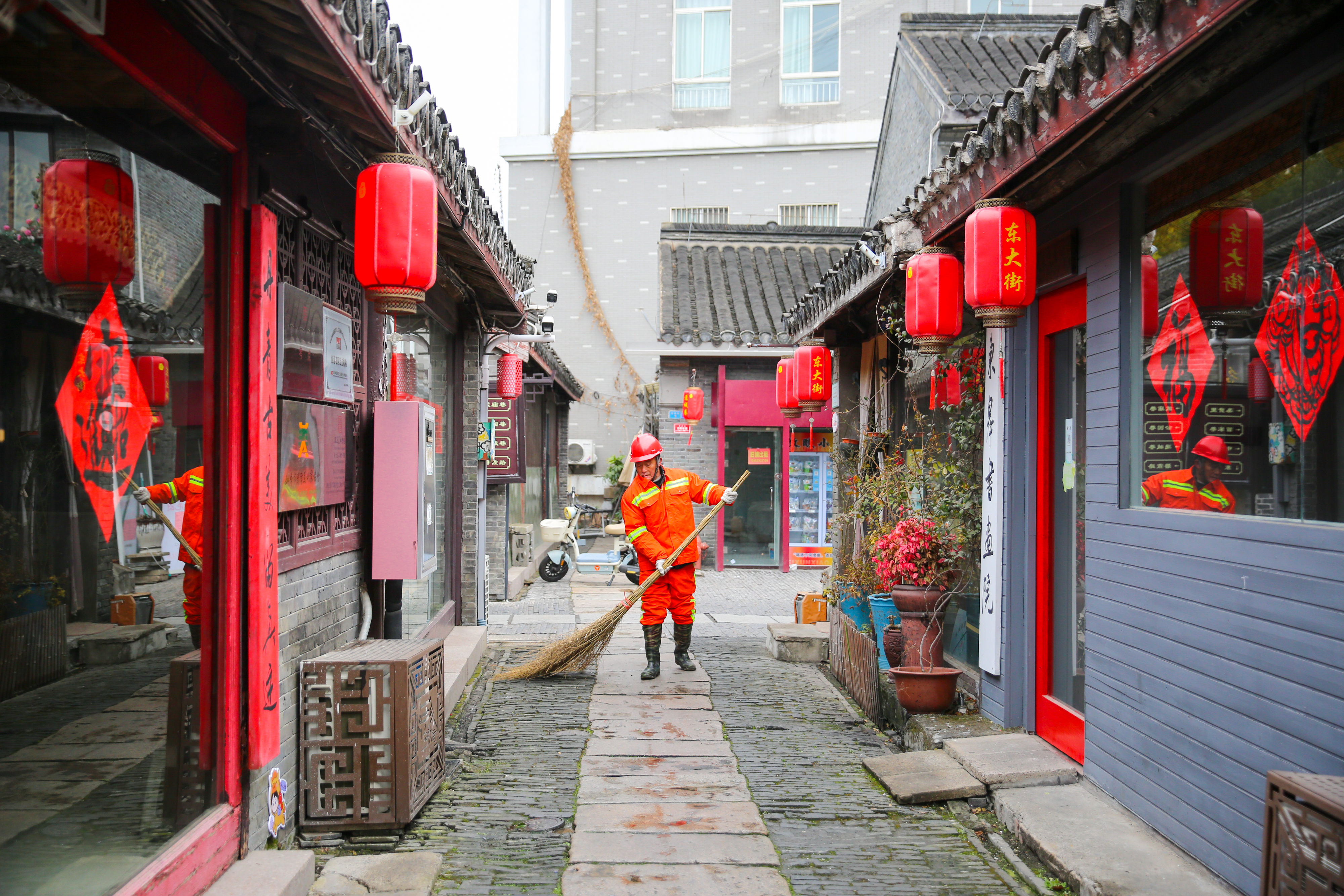 除夕,环卫工人在如皋市东大街历史文化街区清扫垃圾(徐慧 摄)