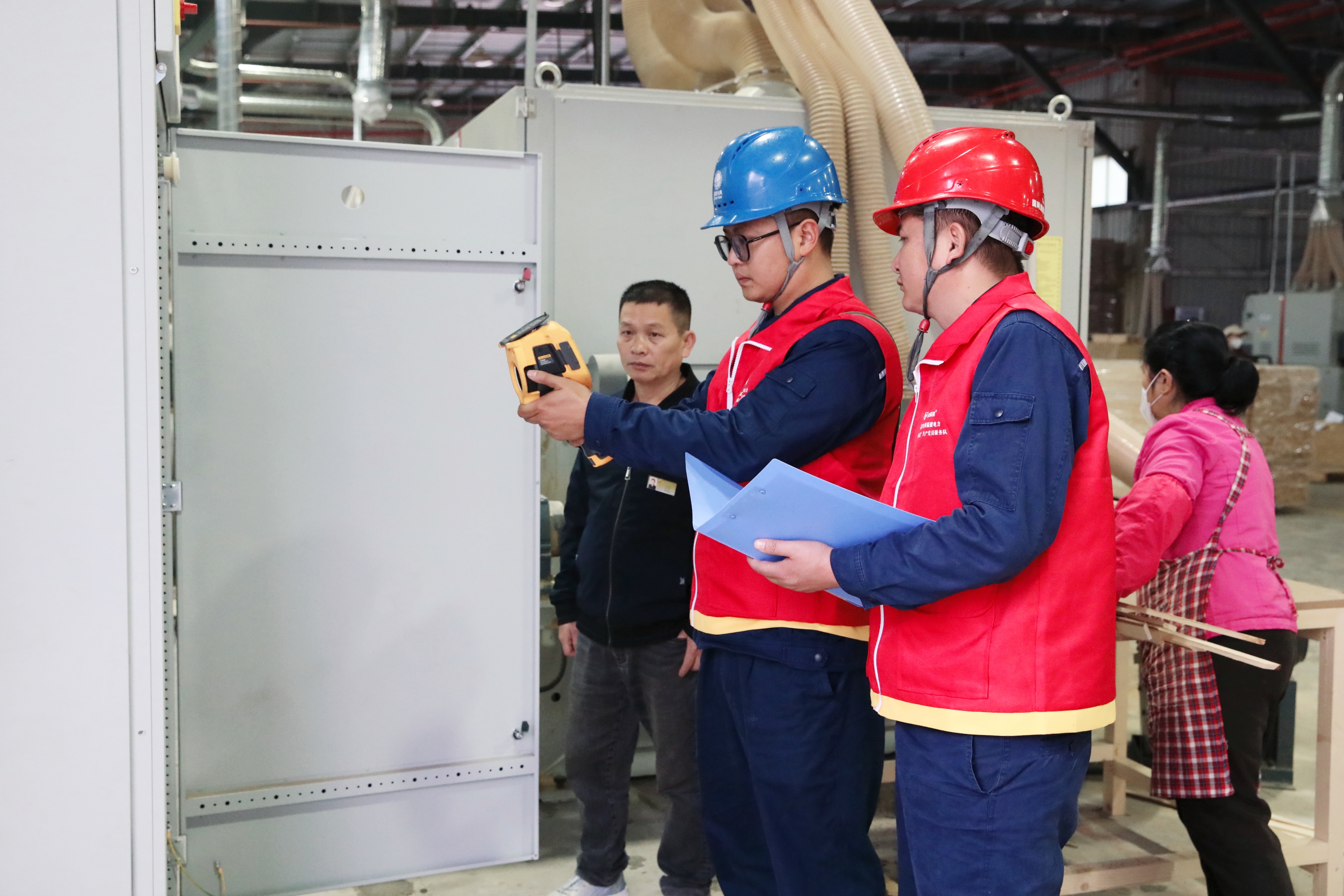 2月26日,国网福建龙岩连城供电公司员工在朋口镇工业园区连城县丰海竹木业有限公司车间开展安全用电检查。(林海秀 摄)