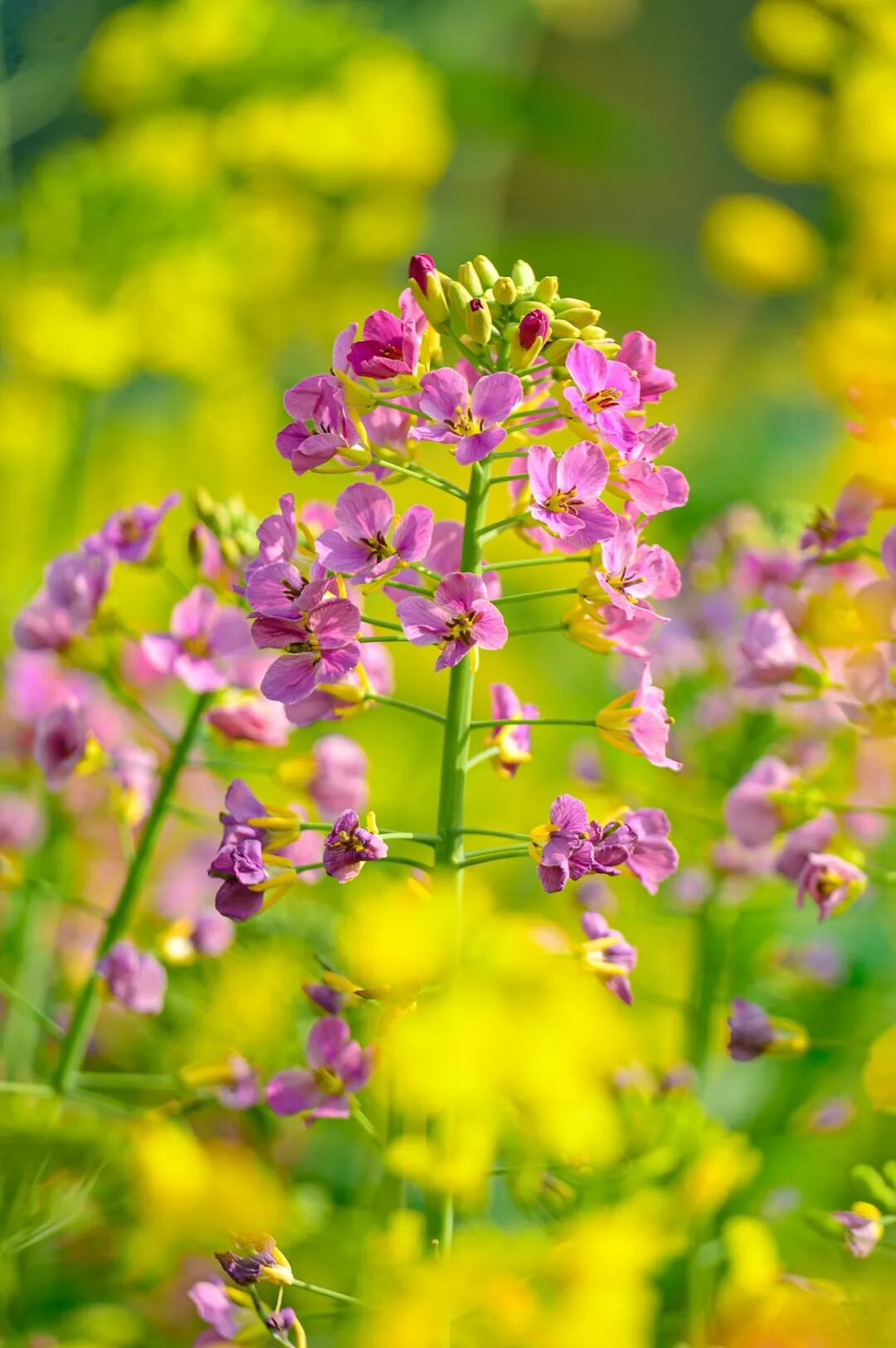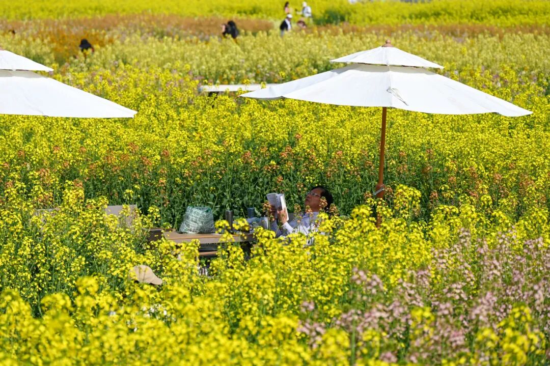 除了金灿灿的传统黄色的,还有粉的,白的、紫的彩色油菜花也竞相争艳,在微风里摇曳生姿拼凑出大地上最绚烂的织锦,仿佛大地被打翻的调色盘。大批游客前来赏花踏青在花田边围炉煮茶、品尝火锅享受着成都春日里的限定松弛感。