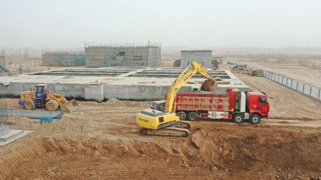 柯坪县城市污水处理厂(二期)工程现场,工程机械轰鸣作响,施工人员有序作业。(艾克拜尔·买买提 摄)