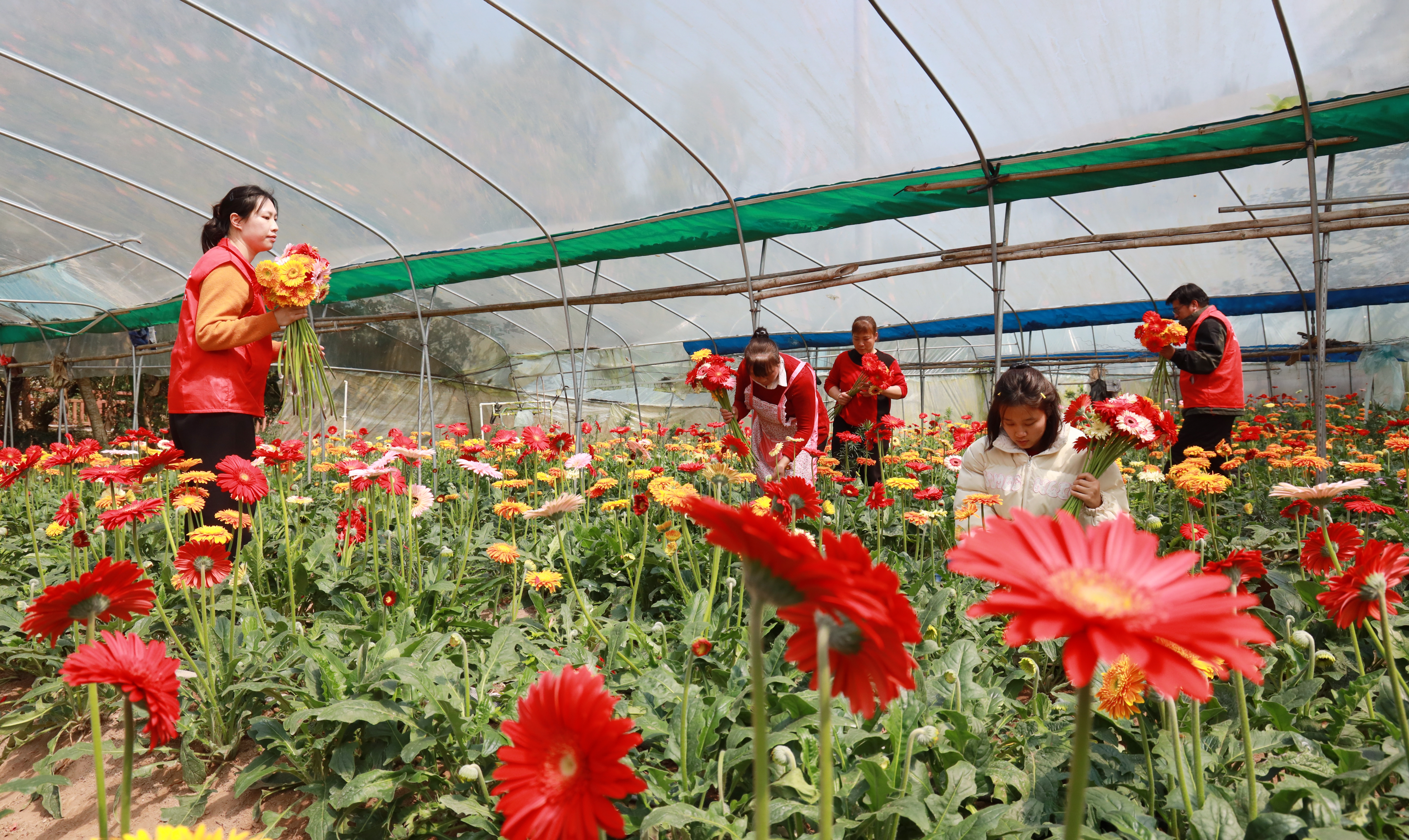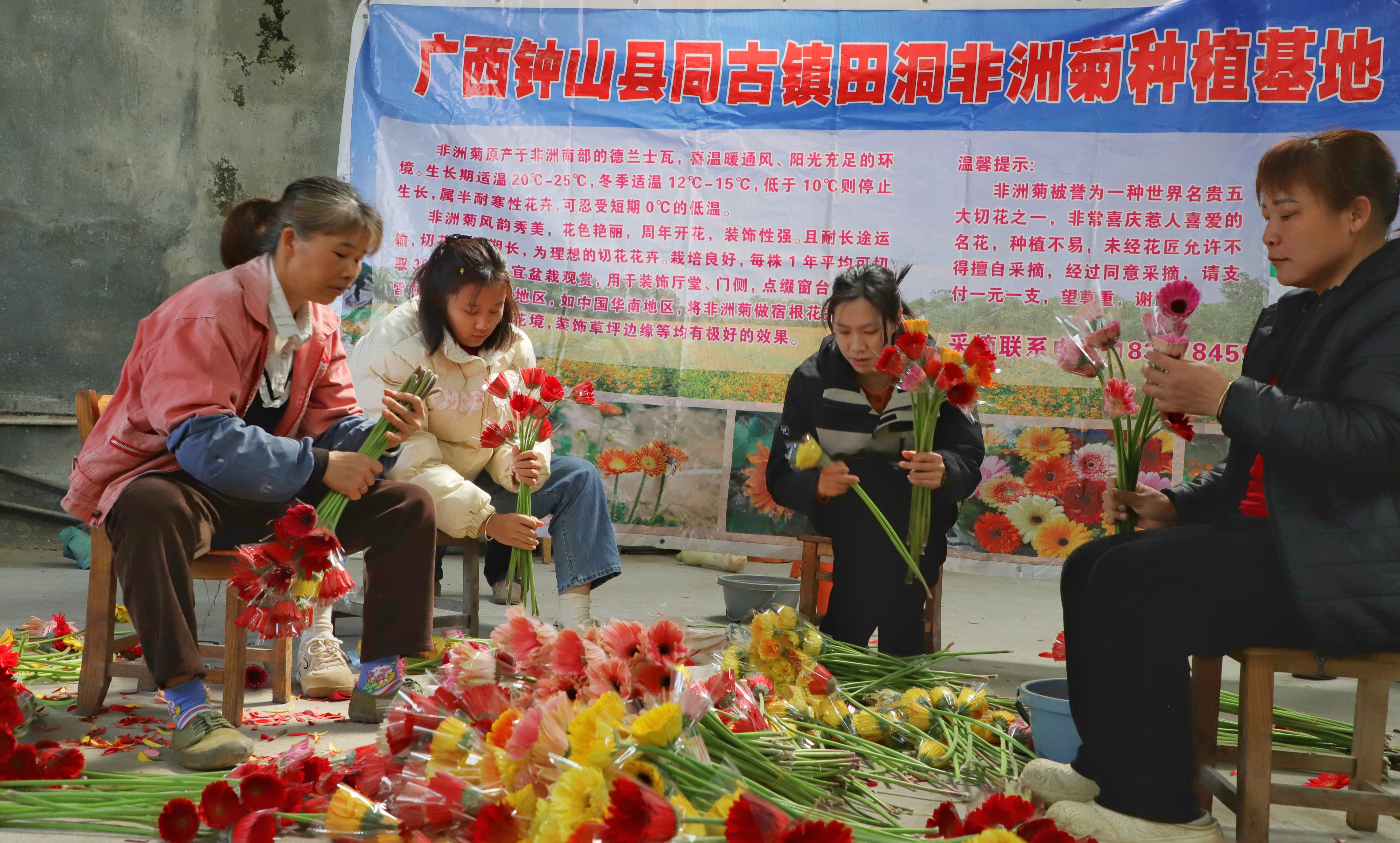 花棚的主人是村里的脱贫户叫蒙任成,凭借着多年在外打工学到的非洲菊种植管理技术,他发现这种花卉容易种且四季有花,适合在家创业。几经思考,夫妻俩在村里租下了地,搭建大棚。每年3月,他们先把土地铺好,将花秧种下,然后就是一轮接一轮的除草、施肥等日常管理,如今已进入第九个年头。