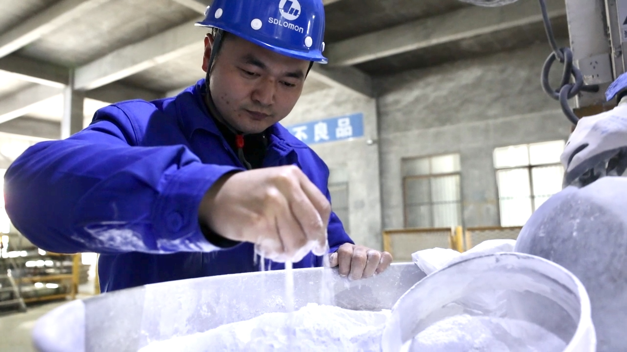 胡正超在车间查看饲料级磷酸氢钙(董晓旭 摄)
