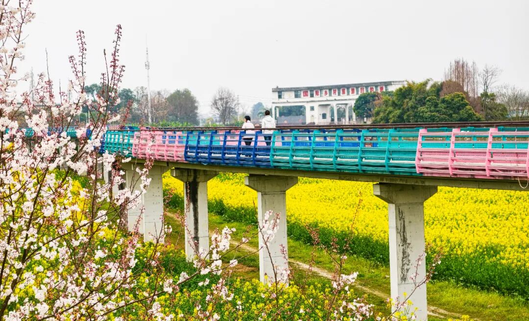 要说郫都最动人的春色,三道堰双虹桥必须榜上有名。成都首条空中绿道如长虹卧波,斑斓的栏杆在阳光下格外亮眼,人行其上,仿佛漫步云端,一低头便是满眼惊喜。