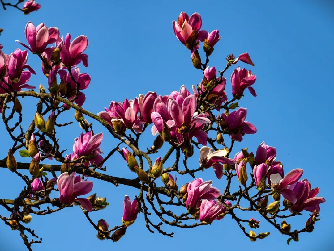 不必刻意寻找,漫步河畔,不经意抬头便撞见一树惊喜。白的如雪、紫的似霞,玉兰花重重叠叠挂在枝头,亭亭玉立、清雅脱俗,像一团团温柔云朵停驻枝头,开得热烈却不张扬。