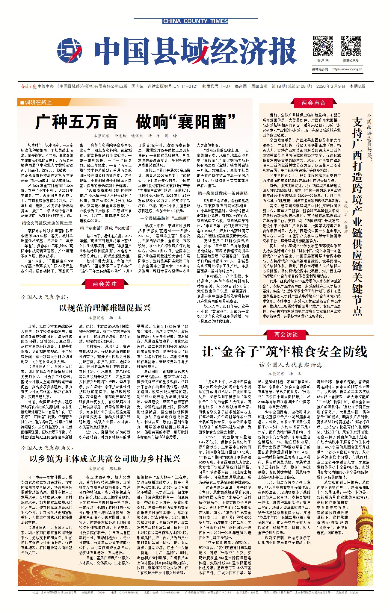 今年全国两会,赵治海带来的建议直指谷子产业发展痛点与潜力。他说,当前谷子消费仍局限于小米粥,人均年消费不足1公斤,而作为粮饲兼用作物,其价值远未充分释放:谷草粗蛋白含量高达17%,接近豆科牧草,同等水土资源下种植牧草谷子的蛋白质收获量是种粮的2—4倍,且干物质降解率显著高于玉米秸秆,是优质饲草选择。发展牧草谷子正是打造“第二粮仓”、实现藏粮于畜的关键举措,能从根本上缓解饲料粮进口依赖。
